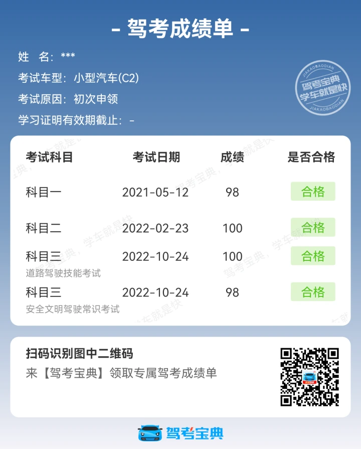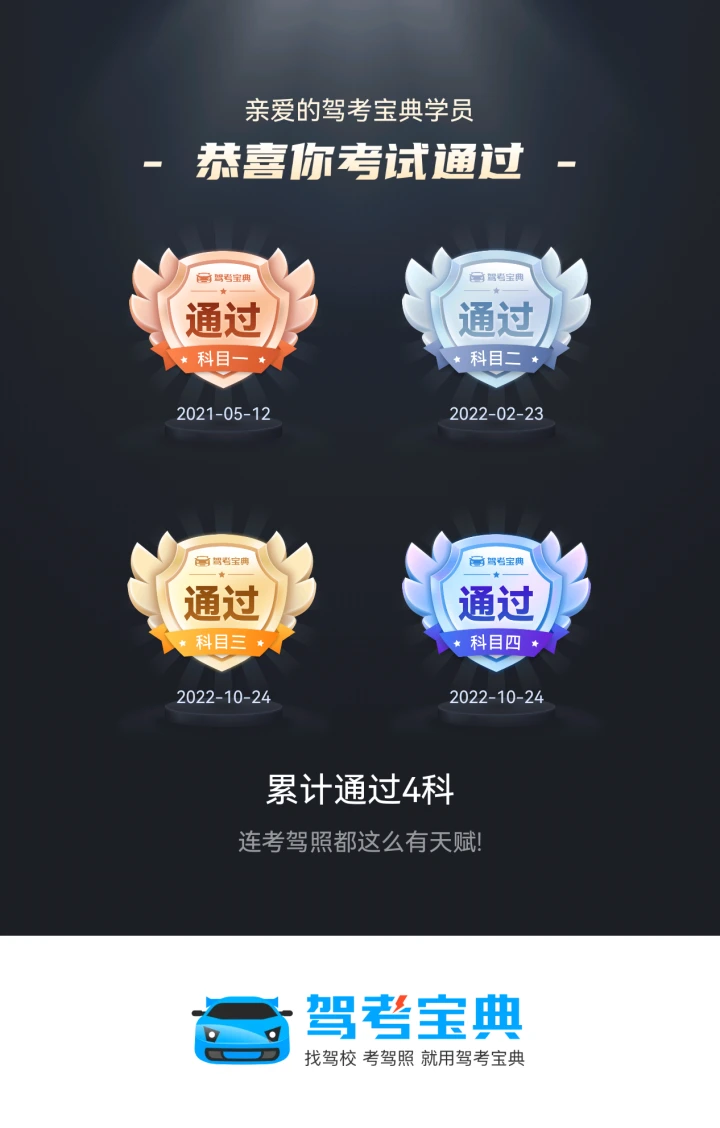 2022年10月24号,科三科四考试一把过,已拿到驾照。科三100分、科四98分。 科四的50道题都是我平时练过的,本来应该是满分。有一道交警手势单选题,知道答案,在选ABCD的时候点错了,扣两分。在这里也特别提醒考生,在选题的时候一定要认真。时间很充足,我是用了一半的时间,答完了所有的题。按照驾考宝典科四的顺序去学习,一定要听老师讲课,掌握知识点,在理解的基础上去记忆,举一反三。多做题,特别是模拟考试题。只要做的题量足够大,很容易就能拿到满分,考试题都是我们平时做的原题。树立信心,相信自己!祝所有的考生考试顺利!早日拿证!分享一点体会,希望能帮到你们。