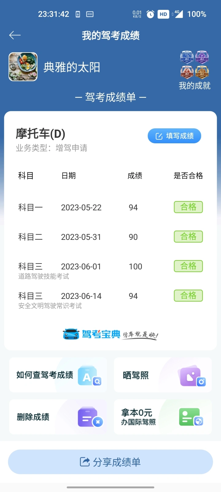 顺利增驾D,特来卸典 闻喜学费980,再加上体检,拍照,总共1000出头。科二科三练车场就是考场,练习车也是考试车,爽歪歪。第一周去交管所审核资料,考科一。第二周考科二科三,考科四前遇到高考,往后推到昨天。考驾照一直运气好。这次增驾D,科目三最后靠边停车,一激动打成左转向了,马上反应过来,向右推到底变右转向,一次通过。哈哈。考C照科三也是运气超级好,上车模拟灯光完毕,接下来应该是百米加减档,系统没反应过来,愣是二档怠速过去了,最后又掉转头回来考的百米加减档;半路熄火两次,光速踩离合摘空档重新打火,系统没有任何提示。这运气,还有谁 技巧分享各位小伙伴:科二绕桩,靠背过桩十公分左右立马打死,打转向太晚了下个桩会撞车头。前轮离边线三十公分车头顺直前行,到靠背过桩十公分再打死,后轮不用看,肯定不会碰桩。期间半离合,车子不动了立马给油,再不动了稍微松一点离合。拐弯的时候不给油,又是半离合状态下很容易熄火。离合全放开又太快,来不及看节点。 半坡起步个人习惯先松一点离合,车子抖动了轰大油门,放刹车,继续慢慢放离合,绝对一次起步不溜车。 我们同批考试的一个倒霉蛋,安全帽感应不上,上去就挂😄 科三主要就是细心啦,各种灯光别忘了。起步前放手刹,打转向,停车后拉手刹,关转向,摘空档。我们县考场评判标准比较严,同一个档位不能连续行驶超过50米,也就是起步后十米左右换二档,掉头前换回一档,掉完头过了斑马线又要换二档,不然就挂了。西安运城都是全程一档。各地标准不太一样。