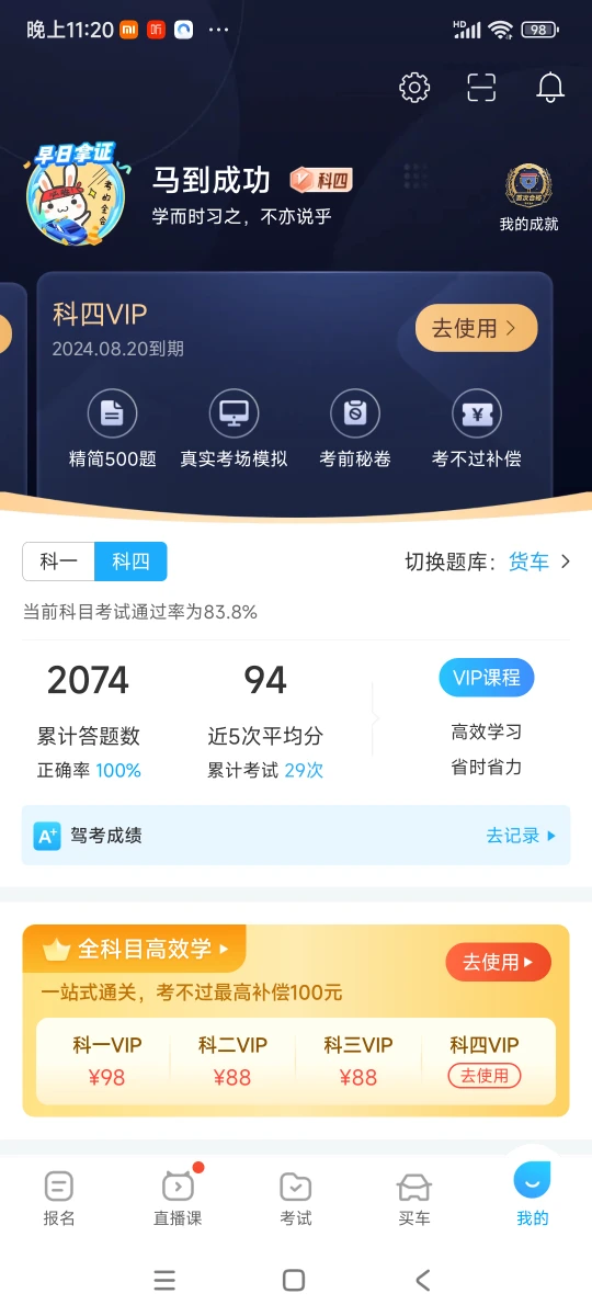 科目一的时候我刷了一半的题。然后开始模拟答题,大约模拟10把左右,勉强够90就去考试了。运气很好93分过的。其实应该更多刷几遍更加牢靠。 科目4的时候,一共2807道题,我差不多刷了2000道以上,之后模拟了29次,感觉有信息了去的,考了满分💯。这东西就需要多看。多模拟,只有多模拟,才能有更高机会过的。 科目二和三 我考试车型 考试车型我是东风天锦,平头东风,比很多考尖头大解放的要简单的多。 科目二最大难点在于倒桩,记住点反复练习。相比于尖头车需要经常记远处参照物类点,这个都是记线,要简单,而且没车头。其次难点就是单边桥,还需要自己找什么时候打什么时候回,1桥上2桥自己找到感觉就行。其他项目只要认真学不紧张出错轻易不会掉的,我掉过两次都死在倒桩上了,这个确实需要多练习。 拉手刹时候要有技巧,按照教练方式拉,因为毕竟考试是感应的,拉手刹动作不对很容易死在坡起和模拟路的前方突然出现障碍物上。 其他的没啥了,听指挥,难点不大。 科目三就是记点,很多人都说简单,实际上并不简单,尤其新手更难一些,主要是用心记住,b2路线比c1复杂的多的多。但是除了记点,真正的难点没啥,跑一圈十多公里,记住点不紧张就过,记不住运气好也能过,但是掉的面更大,所以一定要下功夫记住路线,还有行车习惯一定要记住,每个交通岗箭头处踩一脚刹车才能走。注意加速减速变道挑头 超车 按喇叭都在哪里,人行路在哪里就行了。其他还没啥。 已经拿证了,祝你们无论考什么票的都拿证啊,一把过!!加油加油😄😄😄😄 轻轻松松简简单单,感谢驾考宝典,今日前来谢宝典,祝愿大家考试都是一把过。