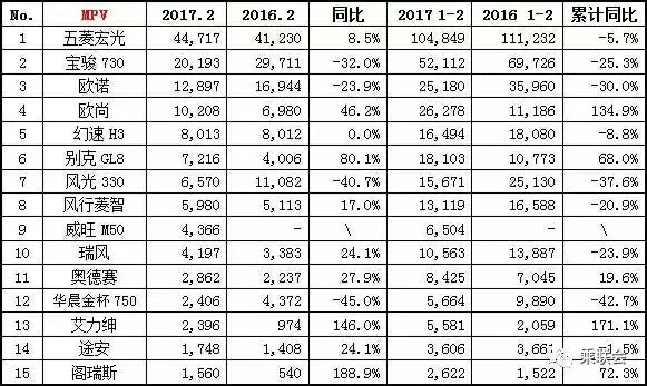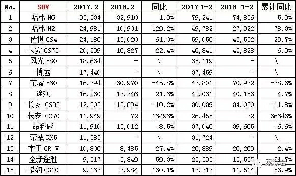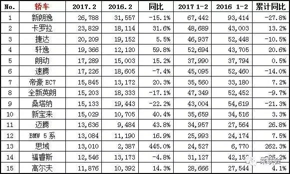 奉上热辣2月销量排行榜,带你一眼看清车市动向! 轿车市场 日系有所回升 帝豪EC7升至第七 2017年2月是市场节后恢复期,总体来看,当月狭义乘用车终端销量达144.8万辆,同比增长9.3%,环比下降30%。综合1-2月数据看,累计销量达352.4万辆,同比下降2.4%,这也是历年来首次出现1-2月累计数据同比下降的现象。究其原因,这与优惠政策退坡、年底提前消费、春节假日提早等不无关系。 在轿车领域,2月销量同比下降0.3%,累计销量下降11.5%。在轿车榜单中,德系车依然占有半边天;日系车已有起色,如卡罗拉、轩逸、思域的同比均有大幅增长。自主“娇子”帝豪升至第七位,由于政策的关系,小排量轿车销量有所回落,排名位次下降或不能入榜。 SUV市场 流水的神车 铁打的哈弗 SUV是国内乘用车增长的主力军,2月销量62.2万辆,同比增长29.2%;累计销量150.7万辆,同比增长15.1%,是乘用车中唯一双增长的子市场。 在SUV领域,除了4个合资车型品牌(途观、昂科威、本田CRV和全新途胜)外,榜单前15中其余11个车型均是自主品牌车型,自主品牌的影响力在SUV领域寻找到了突破口。 MPV市场 五菱霸主依旧 MPV整体下降 国内MPV市场变化一直较少。2月,国内MPV市场同样没有例外。2月,五菱宏光、宝骏730分别销售44,717辆、20,193辆,仍占据国内MPV冠亚军地位。长安欧诺、长安欧尚则紧随其后,分别销售12,897辆、10,208辆。 在合资品牌方面,别克GL8、本田奥德赛、本田ELYSION等车型销量也出现了下降。2月,别克GL8、本田奥德赛、本田ELYSION分别销售7,216辆、2,862辆、2,396辆。途安则由于基数较少,2月表现相对较好。2月,途安销售1,748辆,位列国内MPV市场14名,与上月持平。