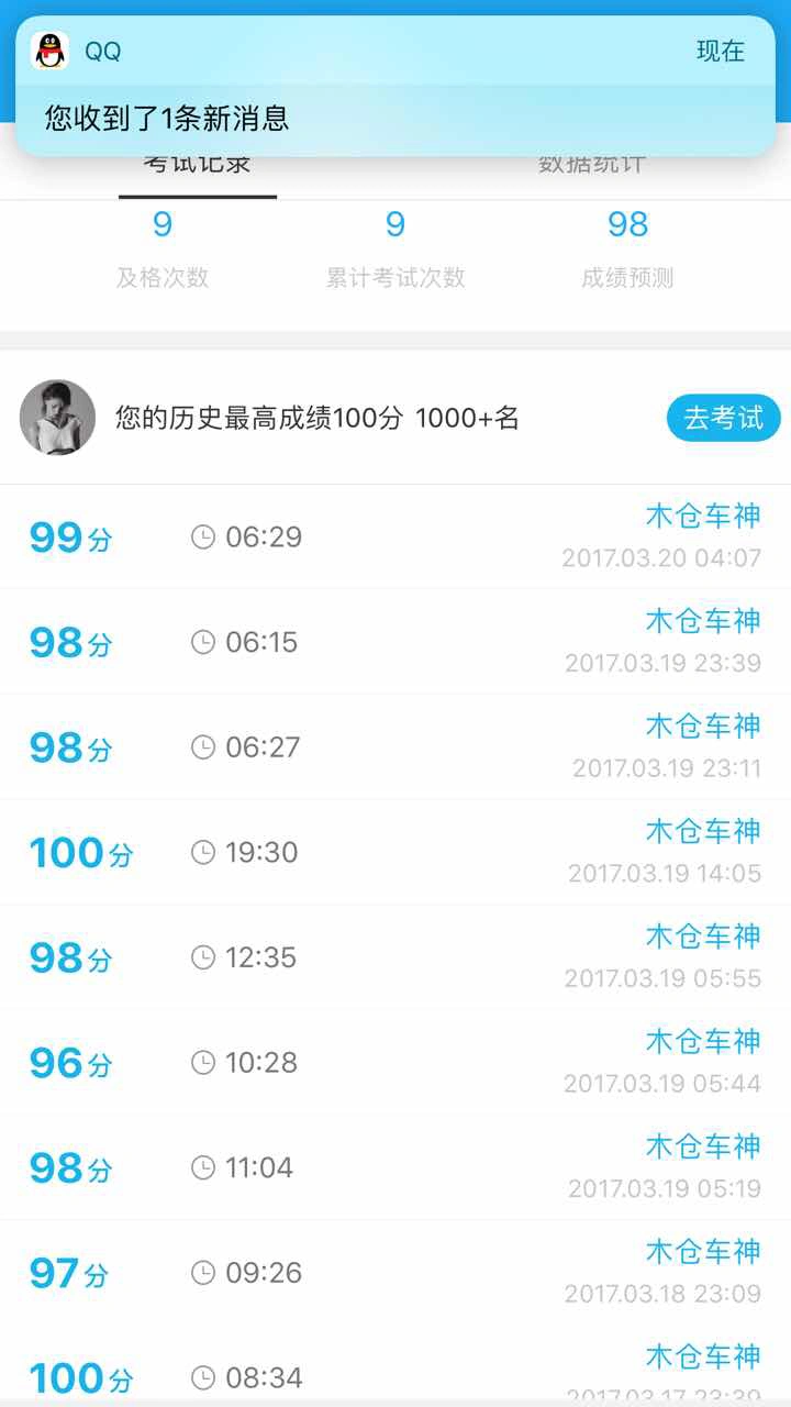 感觉正式考试比练习时要简单很多的样子,这里给的1325道题目都过一次,模拟考试做了九次,就这样正式考试后99分通过啦。 科二继续,早九晚五上班,只有周六周日有时间练车,不晓得两月内还能拿到驾照啊? 好好学习,天天向上吧!