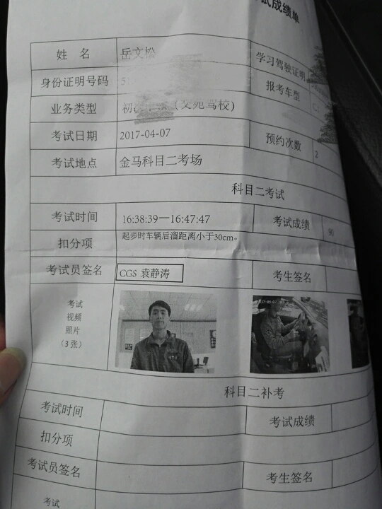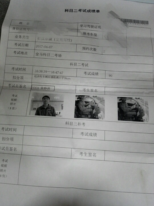 不容易,科二总算过了。坡道那儿停的很好,马上起步时,没成功,后溜了扣10分,然后马上继续起步,车辆都感觉还是动力不足,慢慢抬了1mm离合,顺利通过坡道了,听到 “考试合格”的语音播报,开心! PS:考场有些真滴很烂,离合踏板,刹车什么的不好踩,不是太松就是太紧,不容易控制好。。。。。。 希望各位考友,考试顺利,心态很重要,很重要,很重要,不紧张,放松去考试。