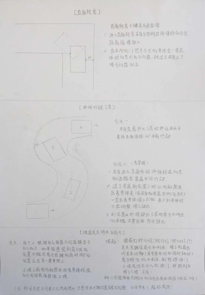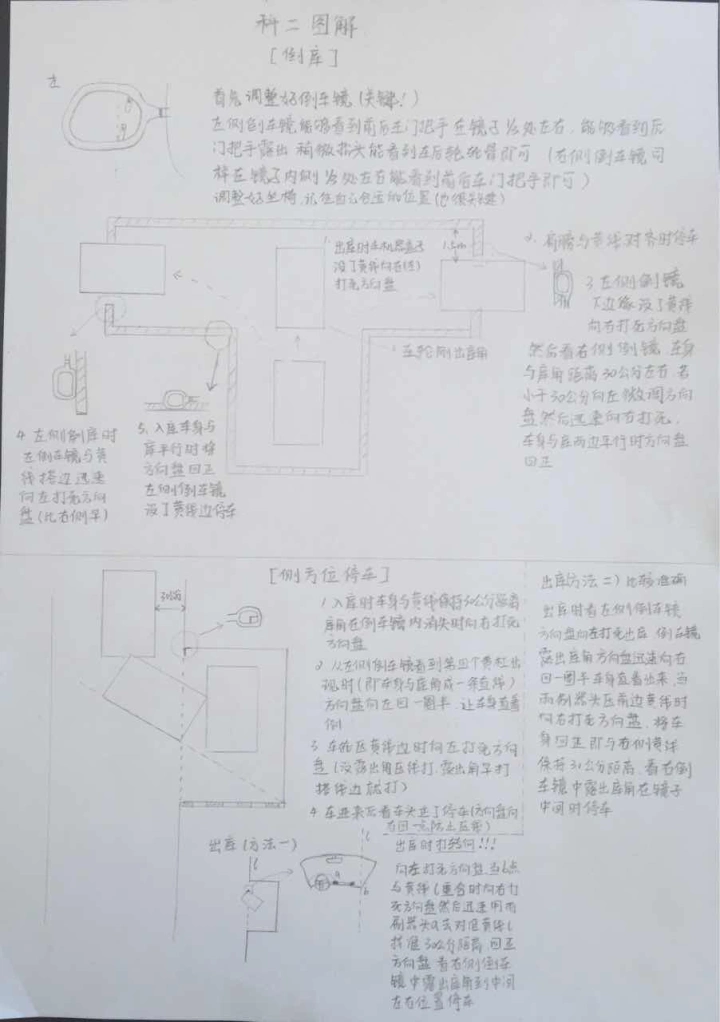 科二关键的是调整好倒车镜和座椅,如果座椅不一样看的点和线就会有偏差;侧方出库和坡起的时候记得打转向灯,以下是我根据自己教练教的方法画的图,画的有些粗略,仅供参考!(每个驾校和教练教的方法都不一定相同,尽量按当地驾校和教练的规定练习)祝大家科二考试成功😊