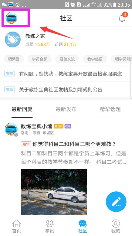 打开【教练宝典】-【社区】-点击左上角头像位置