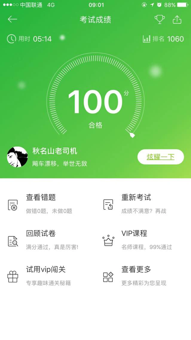 科一95 科二85 科三100 科四100 驾考宝典是真的好用 去之前还担心题跟宝典的有出入 没想到考的时候都做过感觉贼轻松 考前测了一下一百直接把手机关了闭目养神 最后进去考试直接刷刷刷没有一道提示错的 最后交卷的时候看到未满五分钟不能交卷我都惊了 等了五六秒交了一切都解脱了 最后等了四十分钟下证傻笑了好几秒 考科四的大兄弟们不用着急 就在宝典好好练 只要模拟能过90分就去考别担心准能过 祝大家早日拿证