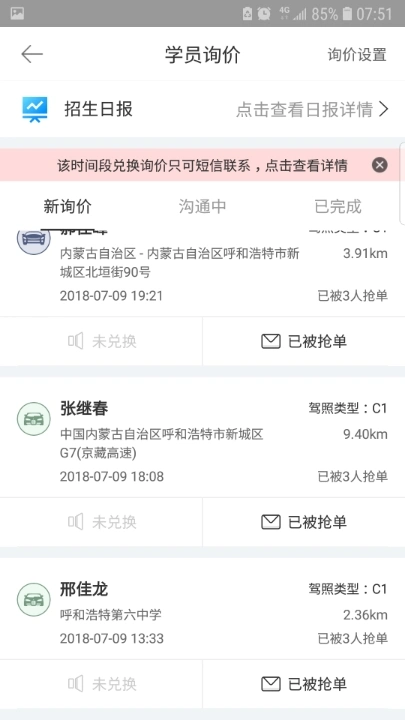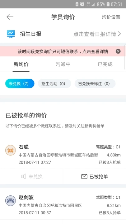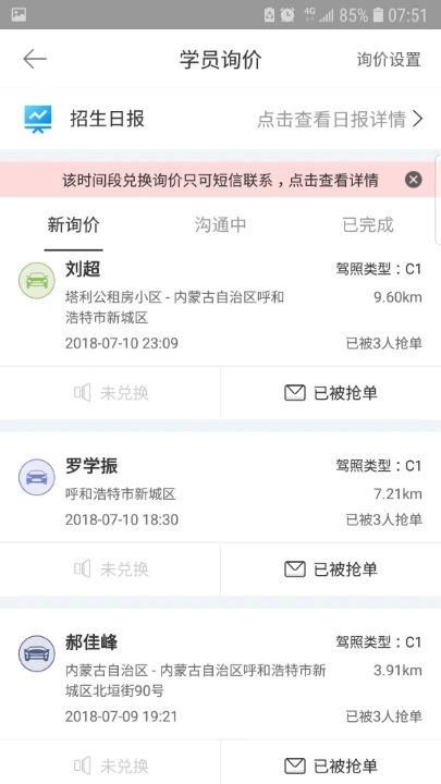 您好,接受询价线索没有收费项目,是根据真实的学员报名情况教练进行接受线索,询价为抢单模式,规则是只允许前三个优先获取线索的教练可以获取到学员的联系方式,建议您收到消息通知快速去获取