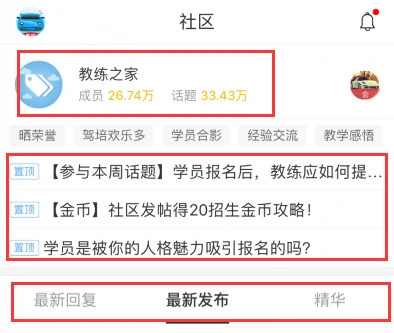 1. 最上方就是我们的主标签“教练之家”下方有各类的副标签,教练可根据发帖内容进行筛选。
