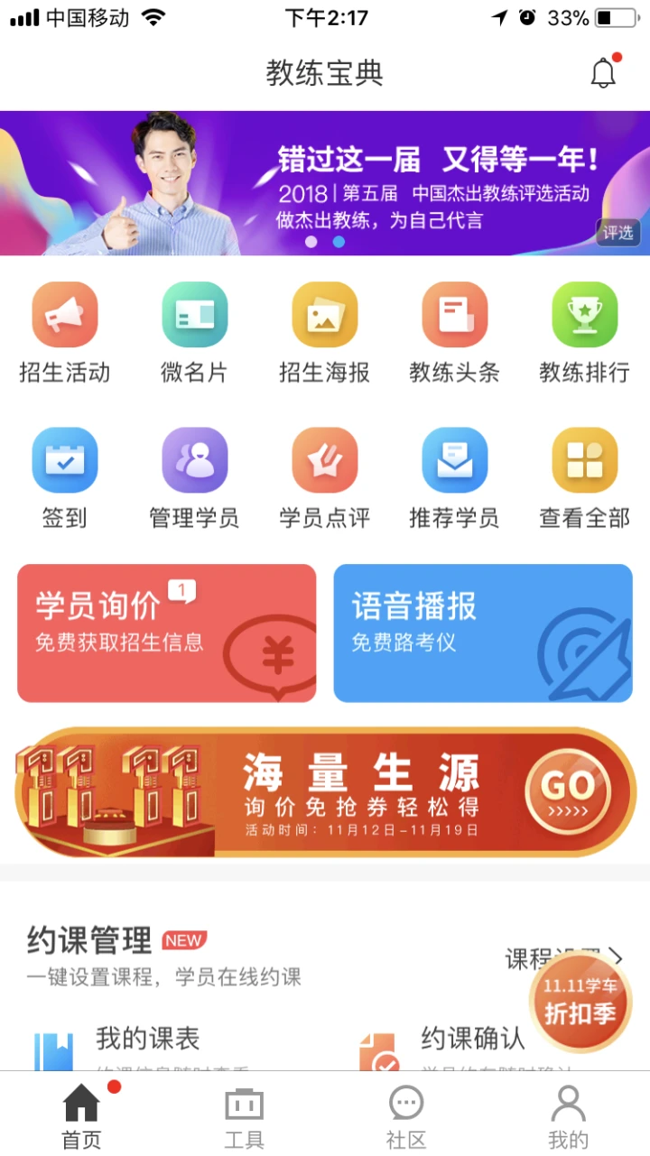 为了方便各位教练使用,典典重新规划了首页的功能布局,教练们在首页就能看到收到的询价数量~同时典典把教练们常用的模块,全都迁移到首页最明显的地方了哦~