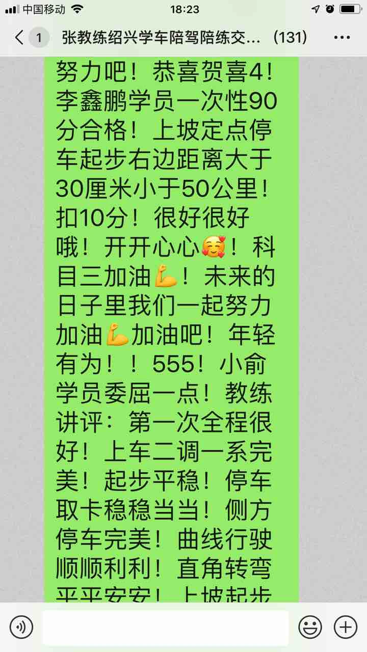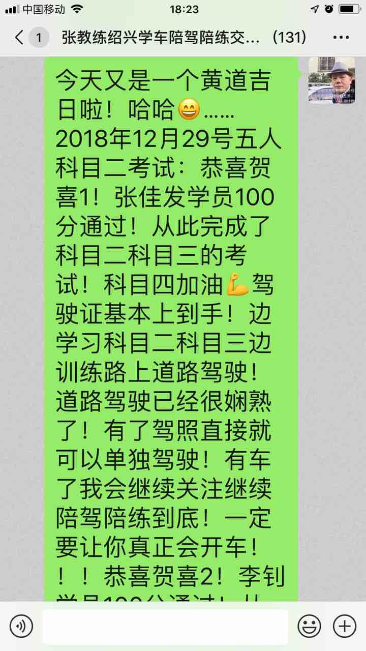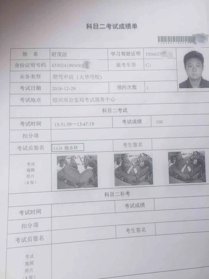 今天又是一个黄道吉日啦!哈哈😄……2018年12月29号五人科目二考试:恭喜贺喜1!张佳发学员100分通过!从此完成了科目二科目三的考试!科目四加油💪驾驶证基本上到手!边学习科目二科目三边训练路上道路驾驶!道路驾驶已经很娴熟了!有了驾照直接就可以单独驾驶!有车了我会继续关注继续陪驾陪练到底!一定要让你真正会开车!!!恭喜贺喜2!李钊学员100分通过!从此完成了科目二科目三的考试!科目四加油💪驾照基本上上到手!小伙子创业精神积极!一直没有时间学车!训练都是需要在中午时间12:00–14:30左右!顽强奋斗!恭喜贺喜啊!终于圆满成功了!恭喜贺喜3!舒茂洁学员一次性100分通过!科目三加油💪!未来的日子里我们继续一起努力吧!恭喜贺喜4!李鑫鹏学员一次性90分合格!上坡定点停车起步右边距离大于30厘米小于50公里!扣10分!很好很好哦!开开心心🥰!科目三加油💪!未来的日子里我们一起努力加油💪加油吧!年轻有为!!555!小俞学员委屈一点!教练讲评:第一次全程很好!上车二调一系完美!起步平稳!停车取卡稳稳当当!侧方停车完美!曲线行驶顺顺利利!直角转弯平平安安!上坡起步完美!最后一站:倒车入库!胜利在望!1前进肩膀对准停车很好!2挂倒档,倒车,看位置右打一圈90度加2-3厘米左右!看左后视镜!看左后视镜!哎呀!估计没有看仔细!注意力不集中!左车尾出来20厘米就应该立即回平方向盘!可是左车尾已经很大了!匆匆忙忙回了一圈半!如果这个时候左竖90度还有希望!最多是右侧小一点!车头部分没有出线!只是右尾角在库位边线上!扣100分!3左出去调整完美,4右倒入完美左右大小很好!5右出库完美!但是就是不合格!