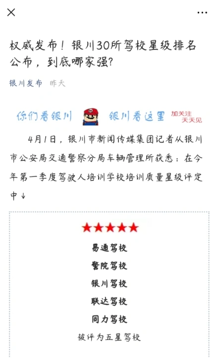 嘿嘿,连续四年的五星级驾校,第五年第一季度依旧是五星级驾校!虽然排名第三,但不是正说明我们依旧有很大的进步空间!加油哇!银川银驾驾校!