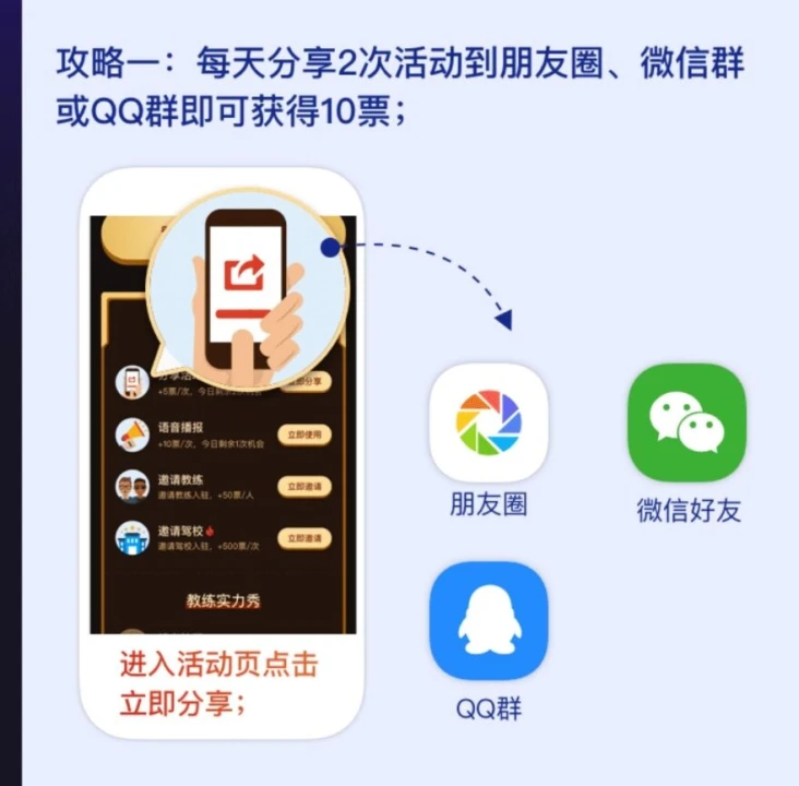 与分享活动、听语音播报相比难一点,如果你比较善于沟通,人际关系不错,可以着重攻克后两个任务,倘若你的人际圈很广,恭喜你,你可以利用这个优势,大量的邀请教练和驾校,拉开与其他参与者差距;