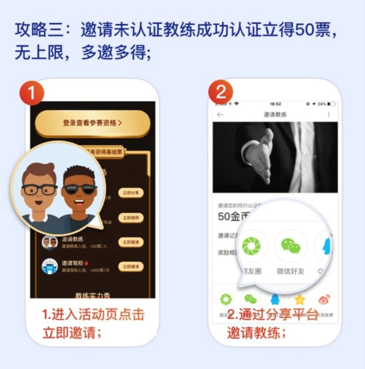 邀请教练和驾校获票较多,并且每日获票数没有上限,但邀请对象必须是新用户(未入驻平台),需要被邀请的教练和驾校提交认证材料完成认证后才能获得票数;