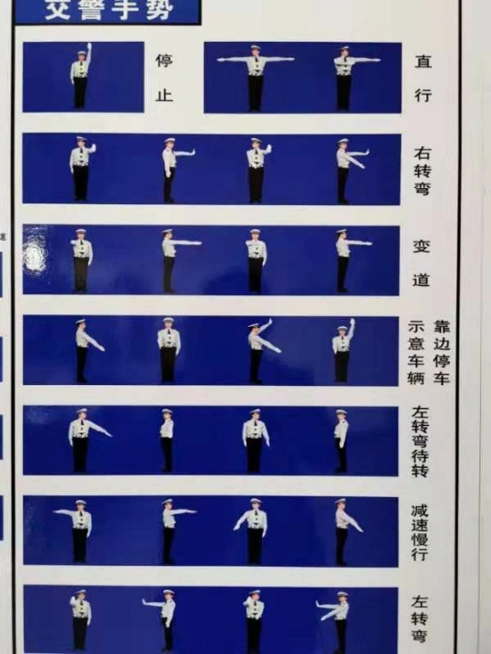用逐个排除法,先排除左转和右转,交警看哪边,哪个手动,就往哪边转。然后排除靠边停车,左手举过头顶,右手45度左右摆动。左转弯待转,左手45度上下摆动。