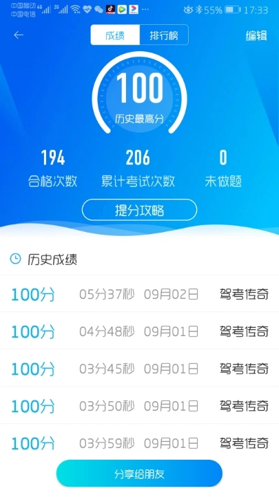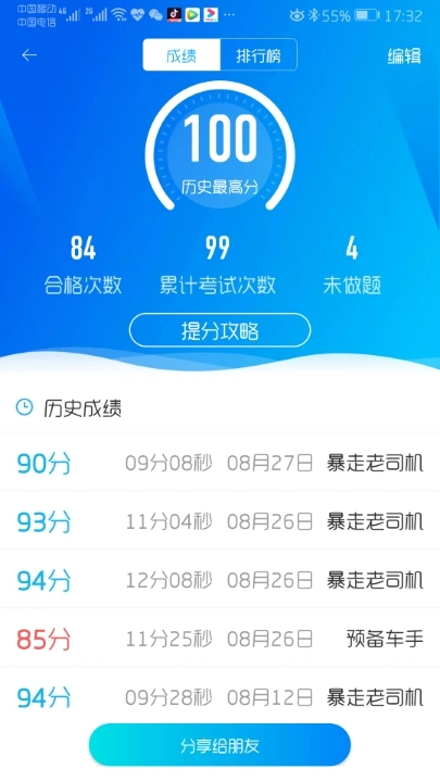7月1日报的驾校, 7月10考科一(97分)。 7月14日学科二,8月14日一把过(90分) 8月18日练科三,8月27日一把过(100分) 9月2日考科四一把过(100分) 9月3日拿到驾驶证。除去节假日和特殊情况共计练车28天。 回想练车的点滴,感觉也是一份人生难忘的经历,说实话拿证后并没有想象中的那么兴奋,但感觉很充实。特别是回想起科二科三考试中的特殊情况,有种抑制不住想分享的心情,希望对宝典没有拿证的学员多少有一点鼓励和经验帮助! 科一,科四不多说,就是努力做题!我科一刷题差不多100次。科四的题开始练科二的时候就每天在刷题了。科四前后刷题200多次。有些人说笔试考试前三天刷题就行,我个人觉得交规还是复习充分好。毕竟拿证后是自己在开车,做到交规熟悉对自己对行人都是一分安全的保障!到时候违法扣分是扣的自己的分,所以奉劝各位科一科四如果时间充分还是刷题越熟悉越好!这是我个人的想法! 科二,科三就是驾驶熟练度的掌握了。先说科二,科二倒车入库练习时间最长,差不多半个多月,说实话期间虽然一直没在教练面前报怨,但心里真心觉得练的想吐。每天就是不停地左出库,左倒库,右出库,右倒库!反复重复。后面的科二全流程到考试前却只练习了五天。 但回想如果没有那半个月的倒车入库练习,自己对离合的把握和考试考点的掌握不会那么熟练。科二能过还要真心感谢那半个月的倒车入库练习!!离合踩不稳,后面的坡道起步之类根本掌握不但要领!所以还没考科二的学员,倒车入库真的很重要,整个科二的基本功都在倒车入库的技巧里体现。科二最最基本功的地方还是半离合程度的掌握。因为考试车有可能是你第一次驾驶,离合的生硬是现场把握,所以平时练习对离合就更要熟练了。感觉手动挡车的驾驶熟练不熟练的精华就在于左脚离合的控制。 说说考试,其实考试技术占一半,运气占一半!我运气不好,考科二分到2号车。估计这车是全考场最老旧的(1号车是自动挡)。考试最难点我个人感觉在是“倒车入库”完成后去坡道起步的途中!因为在这个过程中你要去对边线的点!我们考试场“倒车入库”有4个考场,1,2号考场出库后都要右拐去“坡道起步”,然后再左打死甩正车位后对点。3,4号考场出库就直接对着“坡道起步”。所以在考“倒车入库”前,我故意开车很慢,就等着3,4号考场的车出来才进去。安全员催我也不动。运气很好,磨磨蹭蹭到了4号考场,出库后一条直线对着“坡道起步”考场,然后我有充足的时间在坡道下微调方向就对准了边线。一松离合上去,一把就过! 这是考科二采取的投机。但如果当时脸皮薄,被安全员一催就走,会过但过的不会这么轻松。(因为我考试前熟悉场地时熟悉了三把,死了两把。) 下面说科三,科三总结就是七个字“胆大心细,别慌张”。整个科三我考试途中被别停了三次车!但还是100分过!考试前我就暗示自己,这别想着是考试,就当自己开自己的私家车,正常驾驶就行! 出门右转出来几百米就是人行横道,快要到人行横道50米时正好遇见一辆公交车在上下客。没办法,我只有提前减速,减,减,减。。大概30米距离公交车还不走。看时速下来我降2档又滑行,他还不走,我最后降1档慢慢停住!等他起步了,我松离合开始走。一档速度没提起来时刚到人行横道,这是个考试踩刹车点!我放离合,给了点油。到踩点猛踩一下刹车!系统没提示,我赶紧给油,加二挡,然后三档! 回来路口掉头后遇见个考试车在我前面慢慢悠悠!我30时速慢慢降,到25后和他的距离都在不断缩小,最后他竟然熄火了!我只能降2档,再减速,再降档,1档在他后面停住!他熄火点火,我看到车头猛的一冲,然后刹车灯又亮。哦和,挂了。果然安全员马上下来换他把车开走!我又是一个一个加档起步!! 快回考场的时候在路口又遇见一个砂石车掉头!!我又被别停一次!!整个考试不幸被别停了三次,相当于我比别人多了三次加减档的考试!!但又是幸运的,因为这三次都不是在直线行驶中被别停,不然就挂了!下车后,安全员难得对我说了一句:可以哈!估计他以为我几次都会挂! 科三考试同去的学员他们都没遇上这种情况!写出来一是因为感觉有成就感。二是希望对没考科三路考的宝典学员有经验分享,希望能帮到你。遇事不要慌,到速度正常流程加减档别怕! 很多学员说考试的时候紧张,特别是路考,其实试想下,如果是你自己驾车,旁边没有教练和安全员。那你就不敢上路了吗?毕竟驾证就是拿来自己独自开车的。所以,就当旁边的安全员和教练是乘客,你自己在正常开车的心态去路考就不会慌了! 最后,祝贺自己成功拿证,也祝愿没有拿证的学员,放松心态,每科一把过!