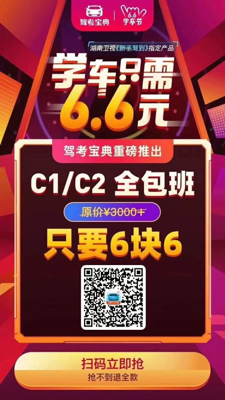 武汉的小伙伴看过来啦!驾考宝典重磅推出C1/C2 全包班,学车只要6.6元!如果身边有还没有报名想学车的朋友可以邀请参加啦,抽中就直接上车学习,不中就退6.6元报名费【仅限武汉地区】赶紧叫上小伙伴扫码参加吧!查看链接