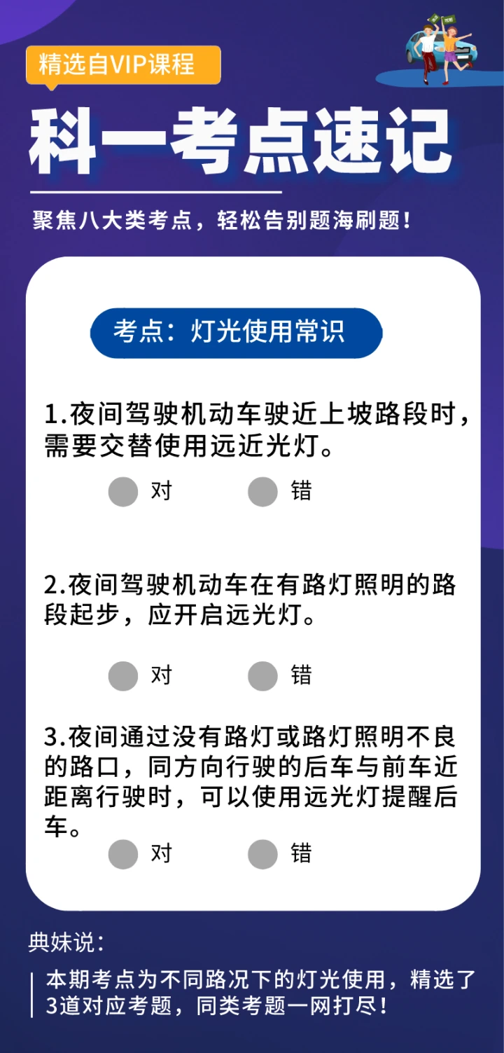 正确答案:1.对 2.错 3.错 VIP专属解析: 题1:上坡路段,坡顶前方路况不明,应【交替使用远近光灯】提醒他人注意。 题2:夜间光线不好,起步前要先开启【近光灯】,确认周围情况再打左转向灯起步。 题3:同方向行驶的后车,如果使用远光灯容易让前车视线受阻,所以不得使用。