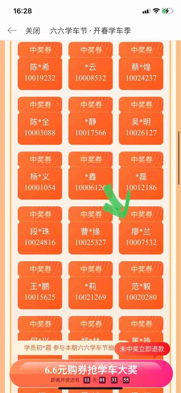 恭喜恭喜~小妹来接好运啦!报名学车只要6.6元,每周六晚19:00开播,没中奖立即退款,不想要也退款。点击链接查看链接 即可参与活动!下一个大奖锦鲤就是你哟~~