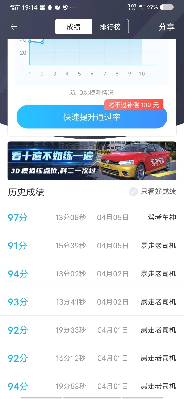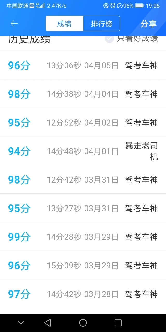 我的还好,每次都是90分以上,最高96分,哈哈😄😄