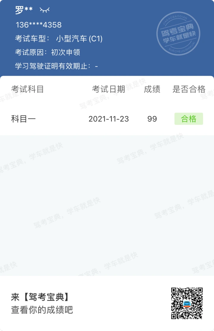 科目一99合格,唯一错的喜题还是因为没有认真看答案,😌科目二科目三要加油喇!
