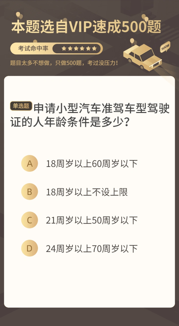 正确答案:B。 VIP专属解析:C1C2,十八即可。小型汽车、小型自动挡汽车准驾车型的,满十八就可以申请,所以选“18周岁以上不设上限”。 查看链接
