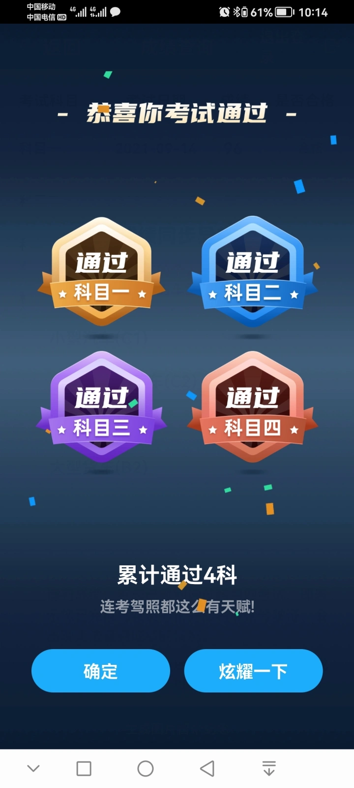 今天科目四满分通过!科目一96,科目二90科目三满分,希望正在学车的兄弟姐妹们都能顺利通过!接我的好运吧💪💪💪