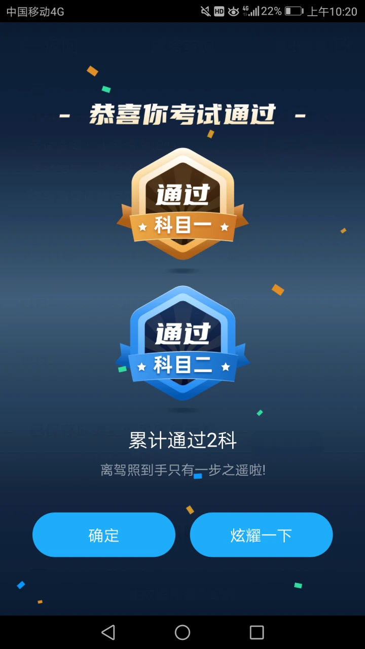今天拿下科目二啦,各位友友们一定要放平心态,紧张就容易出错,刚开始练车的时候真的没信心,教练都对我无语了,练车的时候有很多毛病,学的也不快,觉得自己很难考过科二,虽然教练也是经常吼吼吼,但还是很负责的,吼我也是为了我好,模拟的时候感觉还行,第二天就考试了,老紧张了,一手汗,不过结果还是好的啦,希望你们也都能一把过,接好运啦,冲冲冲!!!