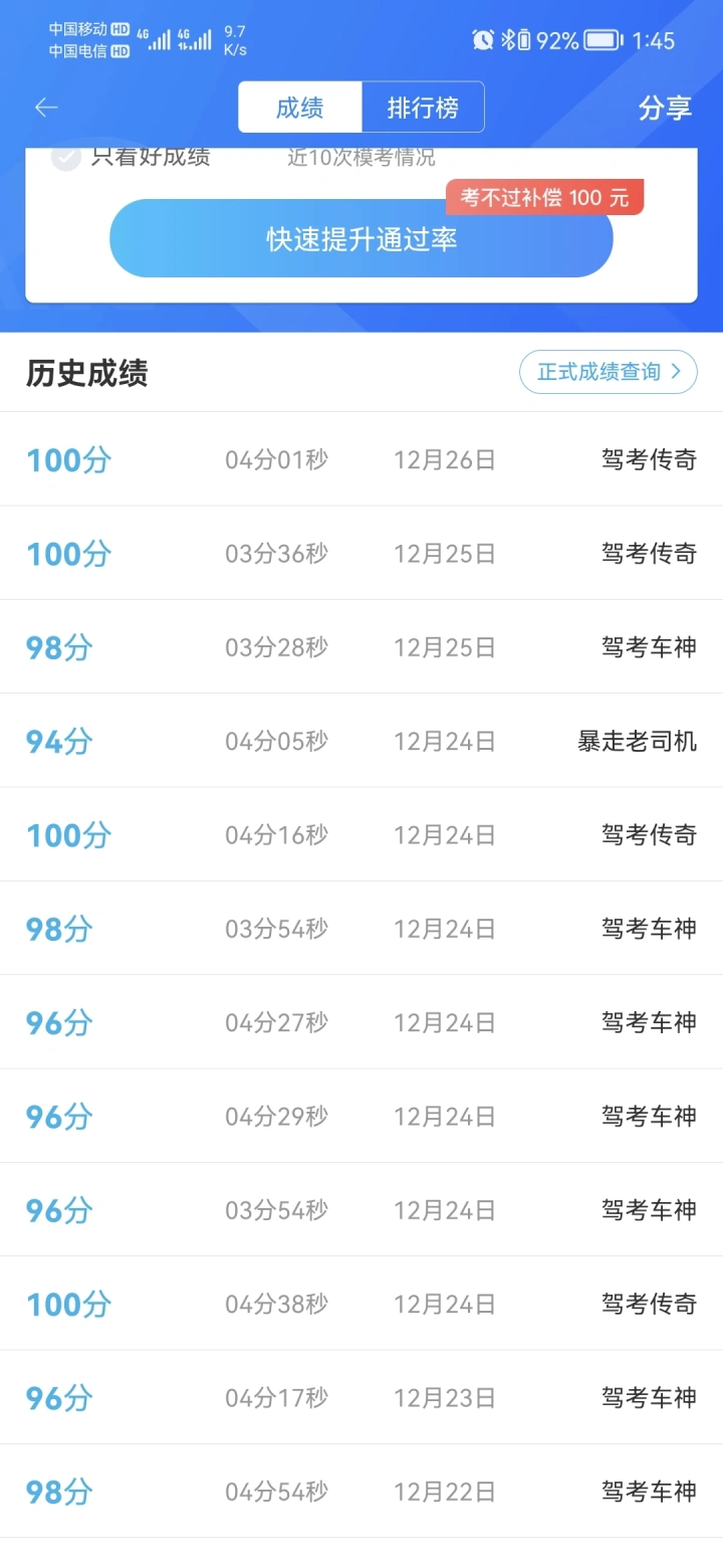 科四已过,好运给你们哦!这就是我刷题得效果,考试认真点就行,第一把试试水88分,第二把全力以赴98分😁😁😁
