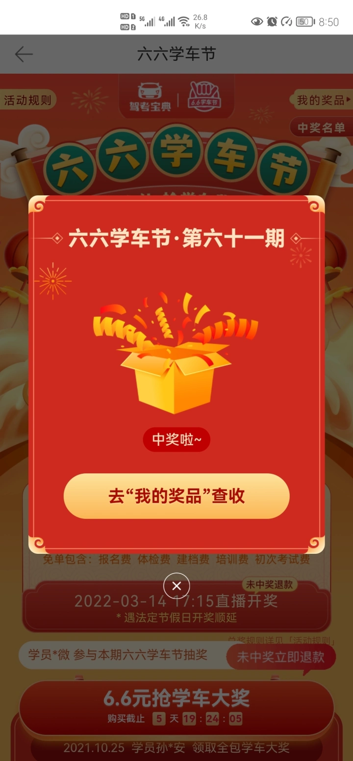 之前一段时间一直都想考个驾照,但还没确定好哪天报名,不知道报哪家驾校,想着先下载个学车软件看看题目,为后续考理论知识做准备,听弟弟说的可以下载驾考宝典app,上面有考试题目,于是我就下载下来. 做题目的时候发现有6.6元学车活动,可以抽奖,不中还退这6.6元,就报着试试的态度参加了,没想到竟然中了一等奖,并且活动真实有效3月初就收到了2000元奖金,这是我第一次中这么大的奖。 感谢这么一个好的平台,让我学车省了不少钱,希望大家都来参加这个活动,不中还退中了奖后不管怎么说都比6.6元多,这么好的一个平台,何乐而不为那,非常感谢驾考宝典这个平台😁😁