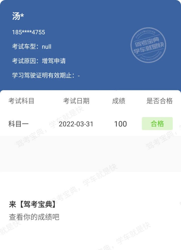 坐标:湖南长沙青竹湖。日期:2022年3月31日。科目一成绩:100分。幸亏赶在驾考改革之前过了科目一,否则上个月就白背了。因为很多处罚细则都改了。今天再次做了一下驾考改革之后的科目一模拟考试题,只考了93分。真险!
