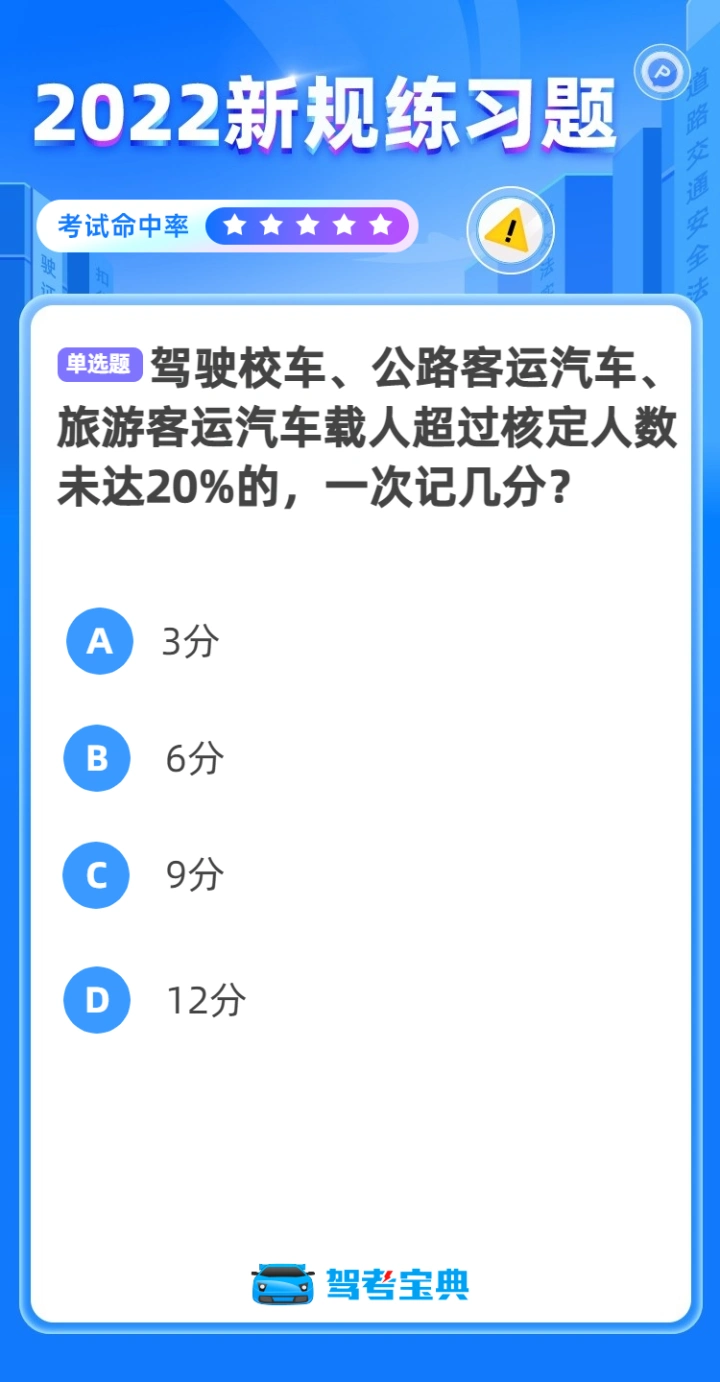 正确答案:B。 VIP精简解析:驾驶校车、公路客运汽车、旅游客运汽车载人超过核定人数未达到百分之二十的,一次记6分。 查看链接