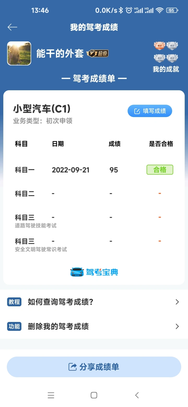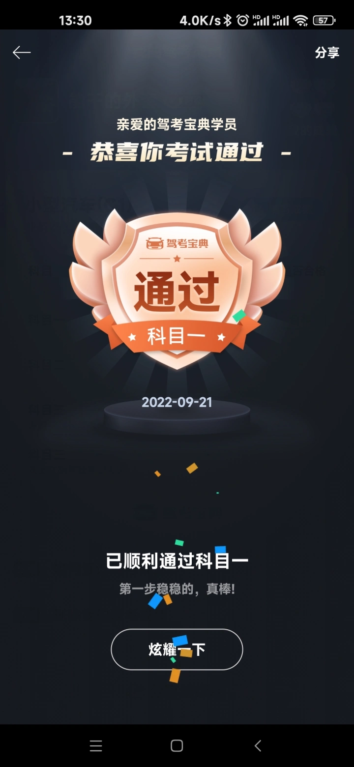 给我自己60岁生日礼物,在驾考宝典VIP小轩老师20天的辅导下,今天早上以95分一次顺利通过科一考试。继续加油!逢考必过!