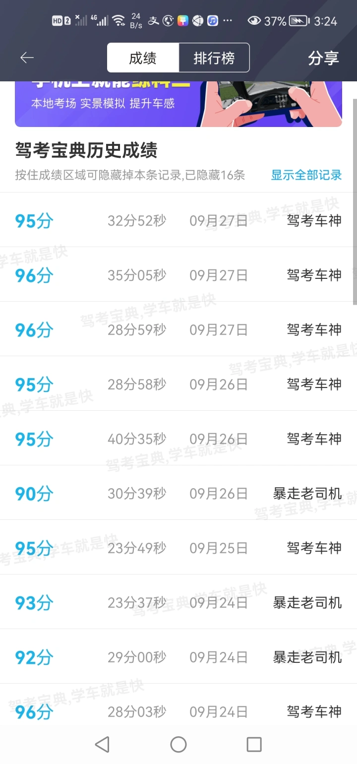 昨天,科目一一把过98分。没有捷径,就只有天天刷题。而且自己还做了一个笔记。终于可以睡个安稳觉了。考试一定不要紧张,记住,这是最主要的。感觉自己上学的时候都没这么用心过。😁😁😍没有给80后拖后腿吧!😚