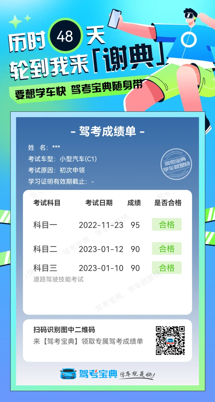 科三过考咯,好心态真的很重要!我最怕路考,教练都抱着我过不了的打算。第二把才过,第一差50米把快到终点了,一下子碰到栏杆了,安全员踩了刹车毙了,第二把发动机熄火扣了10分,然后一路上就没抱啥希望了,以为过不去了,稍微再有一个点出错就满盘皆输了。心想大不了再补考吧,就这么一闷头往前开,没想到到90分过了。所以说不到最后一刻不要放弃,也许会出现转机
