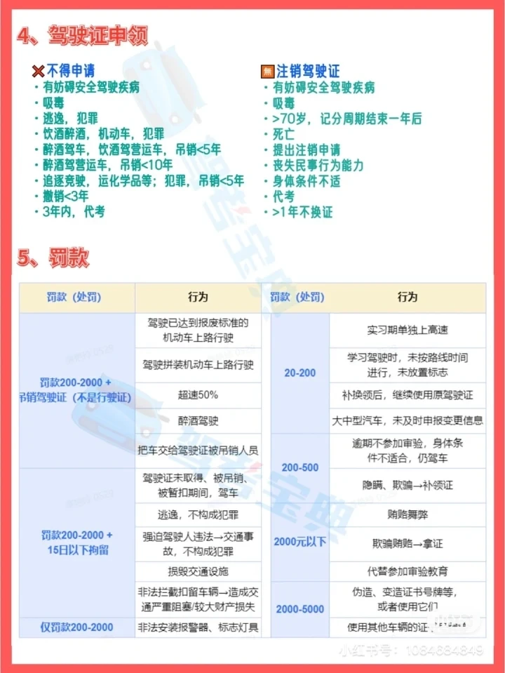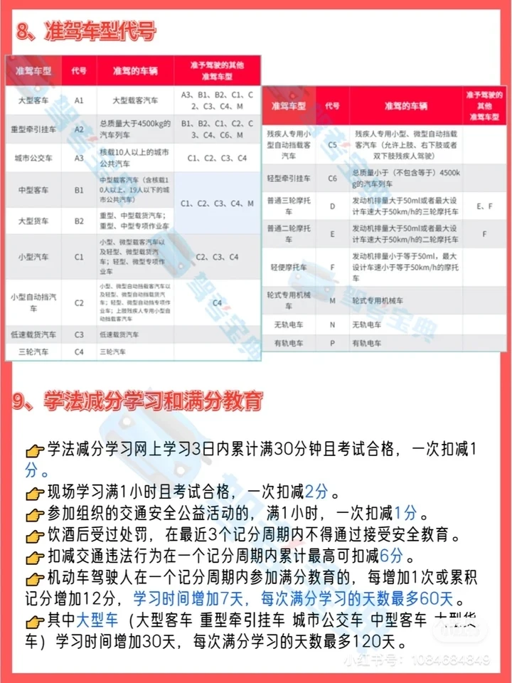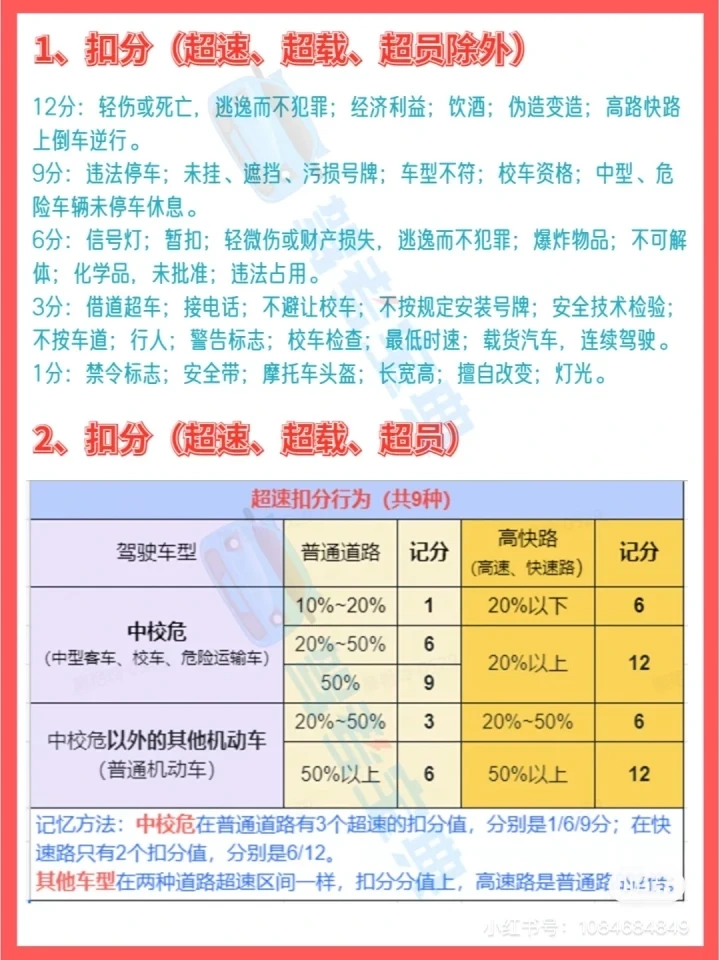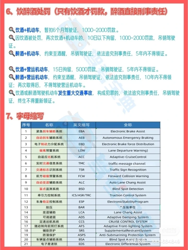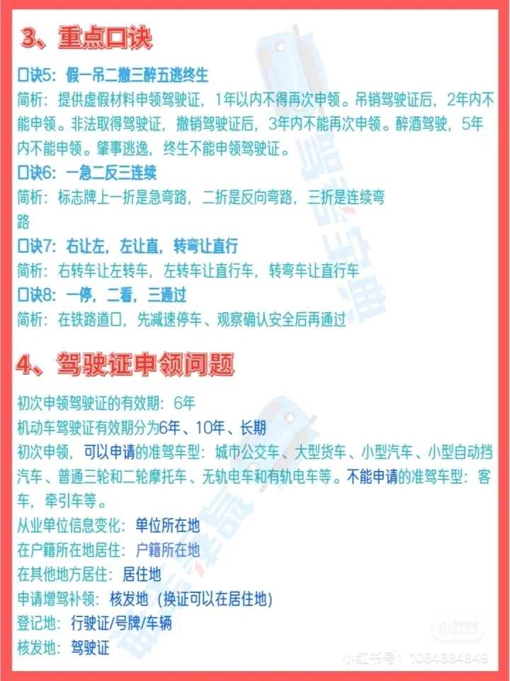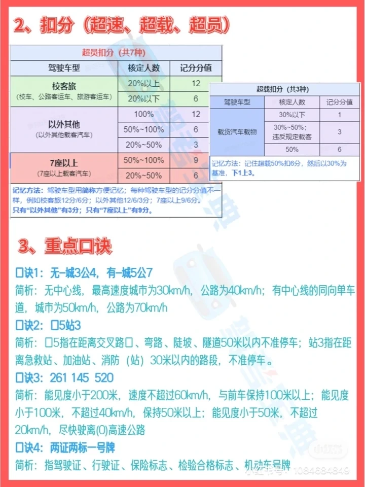 教你几个口诀~祝你考试顺利 1、二吊三撤五醉逃终身。2、转弯过桥上窄道泥路30km/h。3、左右观察左超车。4、交叉转弯窄路隧道桥梁坡道铁路口50米不内不停车。5、驾驶证到期90天,变更30天内换。6、转弯的机动车让直行的车辆先行,右方道路来车先行,右转弯车让左转弯车先行。7、驾驶证的有效期为6年,没有扣分记录的第二次换证的为10年。8、机动车没有违规行为,只有违法行为。9、交警手势大于交通信号灯。10、高速路同向有2条车道,右道的速度范围为60-100km/h,左道的速度范100-120km/h。如同方向有3条车道,右道的速度范围为60-90km/h,中间的90-110km/h,左道110-120km/h。11、有嫌疑的或未放置检验合格标志,未悬挂机动车号牌,未放置保险标志的,未携带机动车行驶证的都是可依法扣留车辆的。 12、驾驶证遗失、损毁无法辨认时核发地车辆管理所申请补发。13、车速超过每小时100km/h,应当与同车道前车保持100米以上的距离,低于100的,不得少于50米。14、续驾驶机动车超过4小时应停车休息,停车休息时间不少于20分钟。15、造成事故致人重伤但没死的处3年以下,造成事故致死的处3
