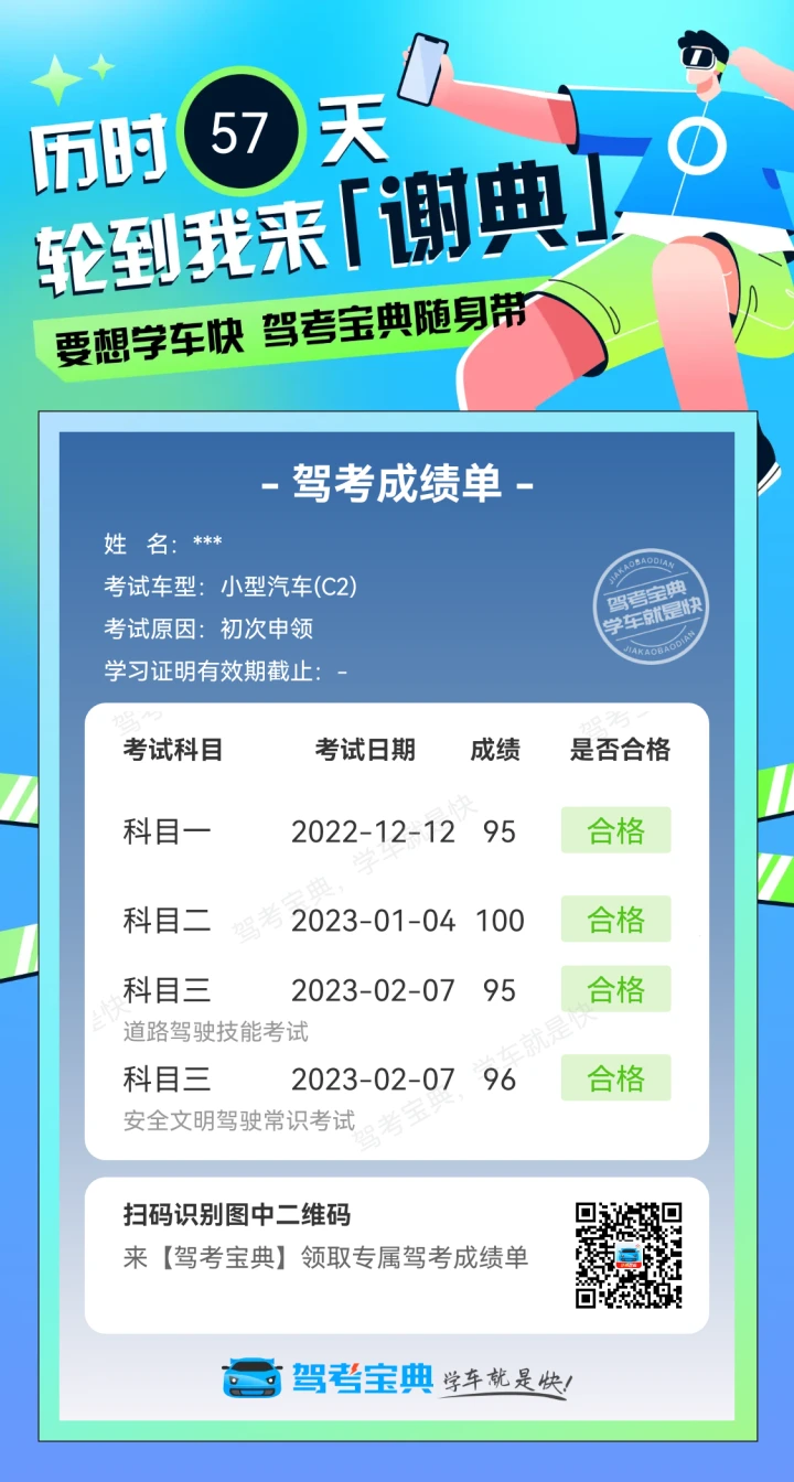今天科三、科四一起过了,拿证了,前来谢典!