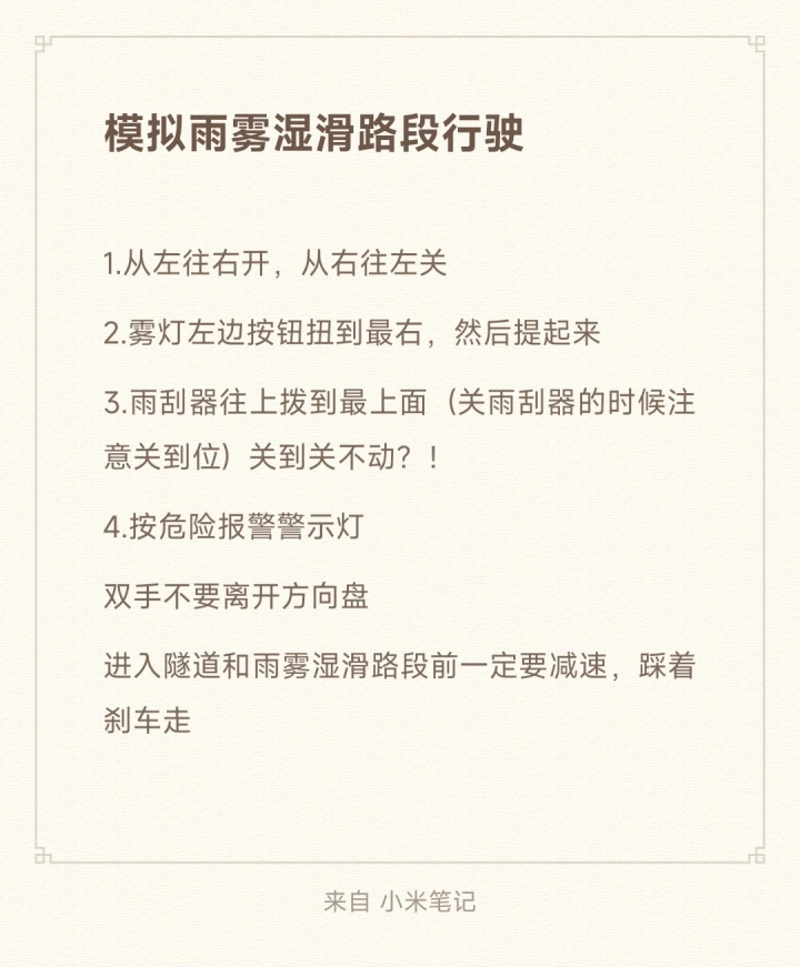 #科二暖心分享 目前已经拿本,接下来发给大家一些我的科目二学车经验与技巧啦。 进入隧道和雨雾湿滑路段前一定要减速,踩着刹车走。开灯顺序从左往右开,从右往左关,雾灯左边按钮扭到最右,然后提起来,雨刮器往上拨到最上面 (关雨刮器的时候注意关到位) 关到关不动?!按危险报警警示灯注意双手不要同时离开方向盘。