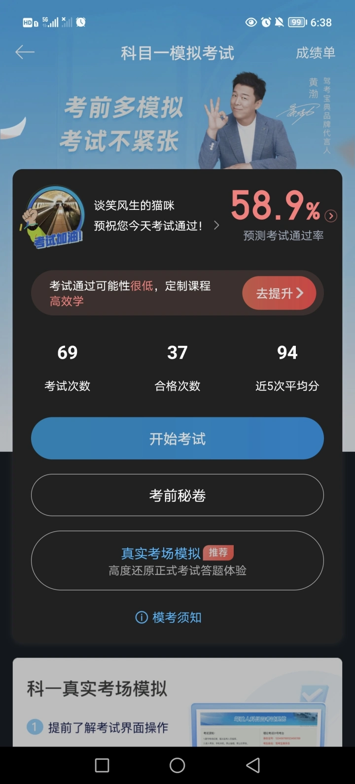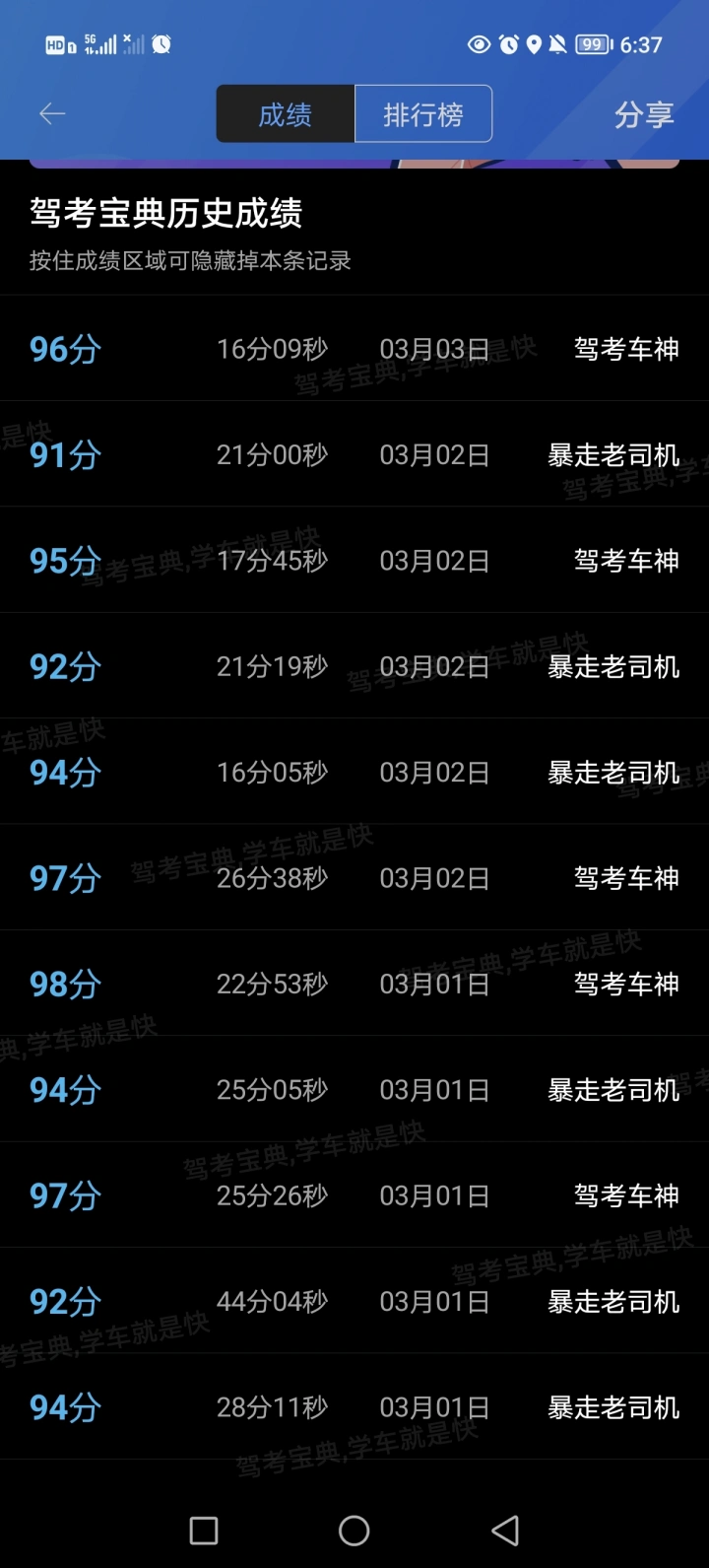 历时九天边工作边备战,考了98分。心得:考试场地因人多,可能不太安静(点鼠标声,喇嗓子声,考官眼前逛来逛去等。。)可能会影响前二十题做题心态,二十题之后渐入状态。平时多练习,考试题比模拟考稍微简单一点。最后祝大家旗开得胜,早日拿下科一。