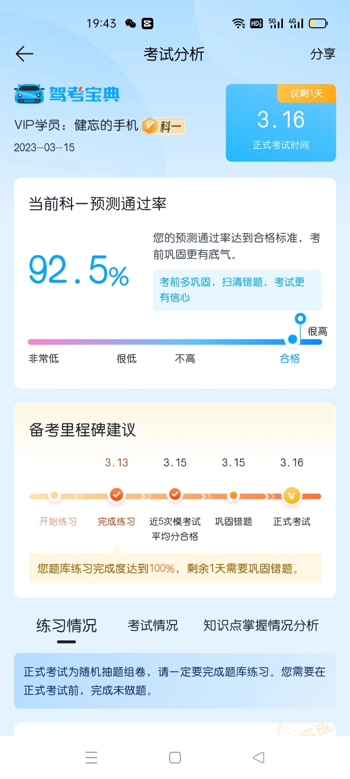科目一刚过,细节决定成败!多多在宝典练题,考前一定要把错题清空~,那个Vip精简题500练练真有效,真实考的基本都是那里面的题,我3月12都才六十几分,3月16今天正式考就过了。
