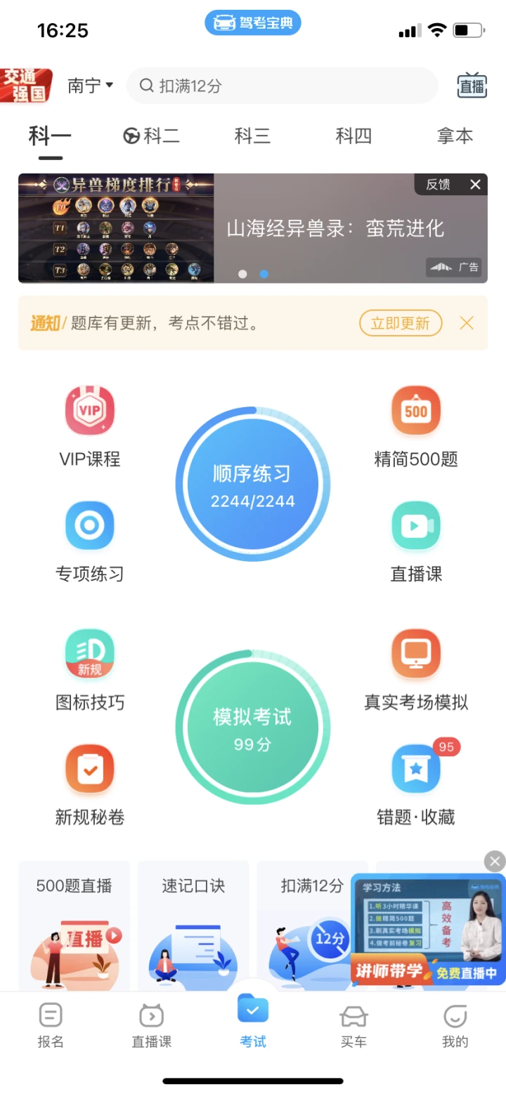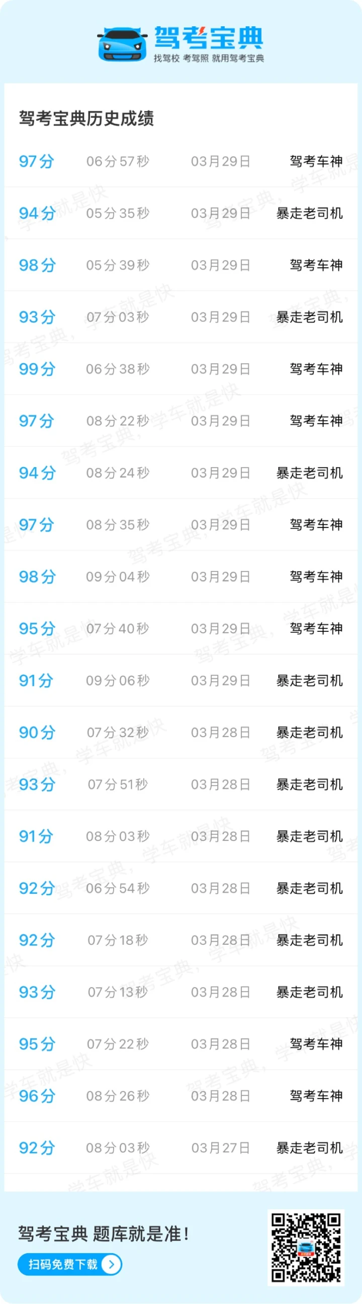 3月1号报名,23号预约上,今天考试顺利通过,前来谢典,分享经验的话其实我是先把那两千道题做完,然后再去模拟考试,刚开始模拟考试的时候真的很烦,怎么样都没有90分,第一次模拟考试及格是10号那天,然后信心就提起来了,接着刷题,然后把不及格的错题完后再做一遍就好多了,今天考试的话,进到考场的时候还是很紧张,甚至答题的时候也还是会,直到答了50道题只错了2道我就知道稳了,扣分题只有5道左右,然后英文简称题一道也没有,罚款题也是2~3道,不得不说考试的题简单多了,大家保持平稳心态就好了,认真审题就不会有大问题了,就是一些理论题,平常稍微用点心记都不会错,还有的就是去考场最好就2个人去,可以让朋友在外面那些东西等你,不然里面考场存包要20闷,总结就这个样了,希望对大家考试有帮助,加油。