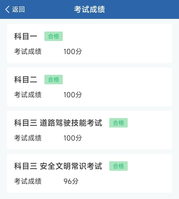 纪念一下,2023年2月23日考科目一, 24日开始练车,中途休息了三天,3月13日考完科目二,休息了六天,3月20日开始练科三,31日考试。因周五下午不能考科目四外加上没看题,就周二才考的科目四。😃😃 终于毕业啦! 读书都没这么认真过。 希望大家都一次性通过,顺利拿证。