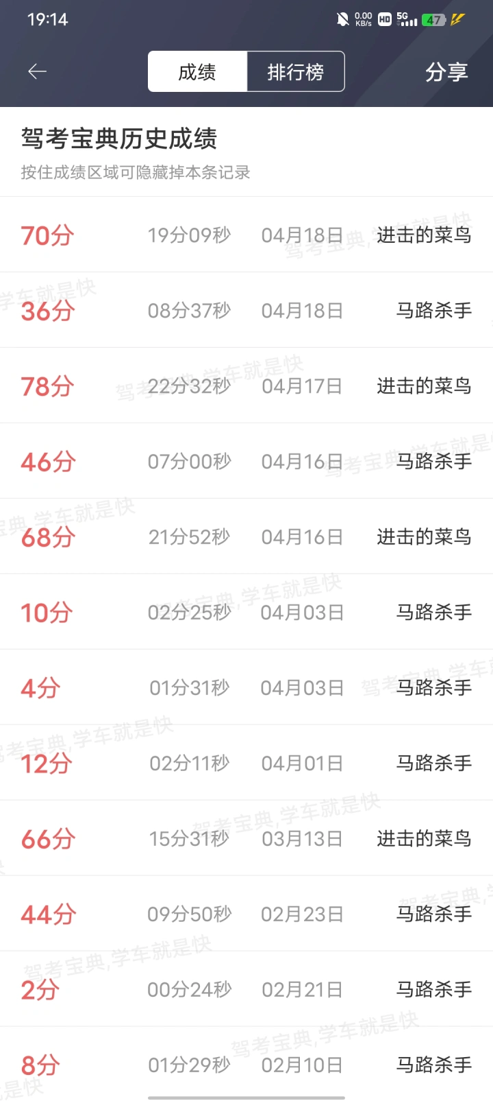 这是我考前的成绩,然后去考试了,选错了一个题。 哈哈哈