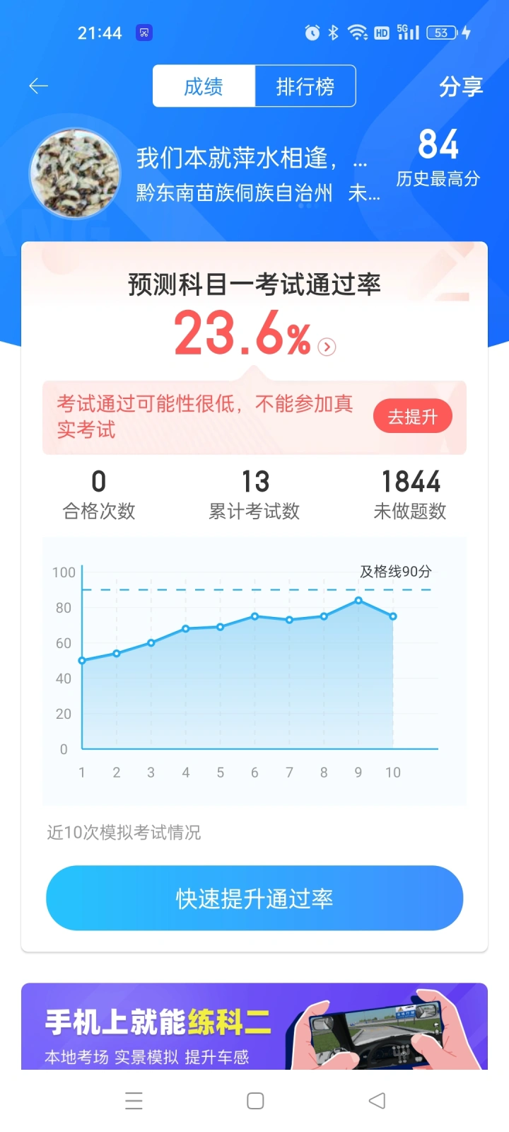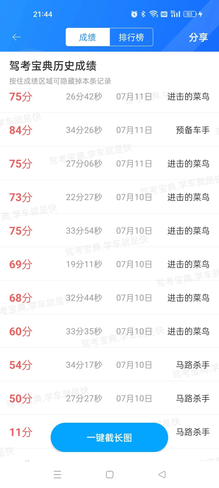 第一天模拟考试十几次,都不及格,第二天去考试心里好慌,真怕考不过,我付出了一天的时间,模拟考了个寂寞,第二天真实考试一把过💪💪,我这叫做早不忙,夜不慌,半夜起来连裤裆,😀😀😀,感谢驾考宝典
