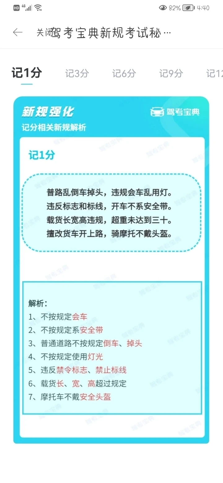 正确答案:C 解析:《道路交通安全违法行为记分管理办法》规定,驾驶机动车违反禁令标志、禁止标线指示的,一次记1分。科目一3小时精华课,知识框架梳理 | 精华考点快看👉查看链接
