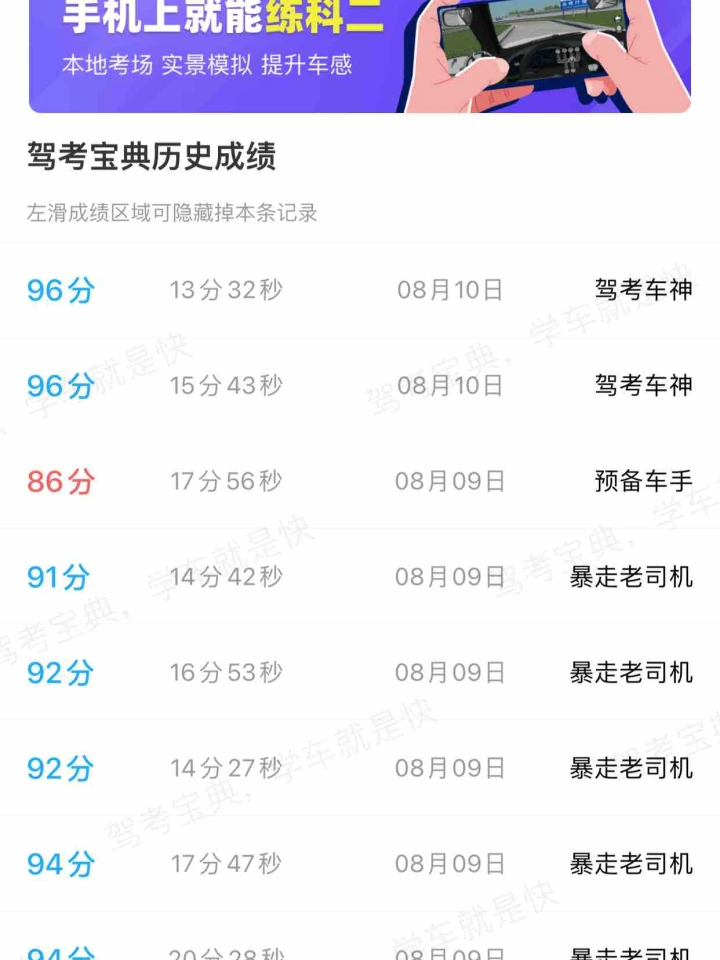 我是87年的女士,科一考了100分,做了14分钟就出来了。我们这考试就50题,一题两分,题目非常简单。分享我的学习经历,我没买课程,看了3.5天宝典,建议有上班没买课程的,从预约第一天就可以看题了,一天看个六百题左右。不然像我集中在后面几天眼睛都有点不舒服。我是把接近三千题练习题先全部做完,平均一天做题1200道,脑袋都嗡嗡的,里面太多类似题感觉花了不必要的精力时间,而且咬文嚼字的,做题做得很胸闷。最后把错题收藏题再看两遍,模拟题做了几次,差不多了。如果想花少点时间精力的,我觉得去做那个600道的精简题就可以了。如果觉得不愿意花钱,那就多花时间了。祝各位好运。