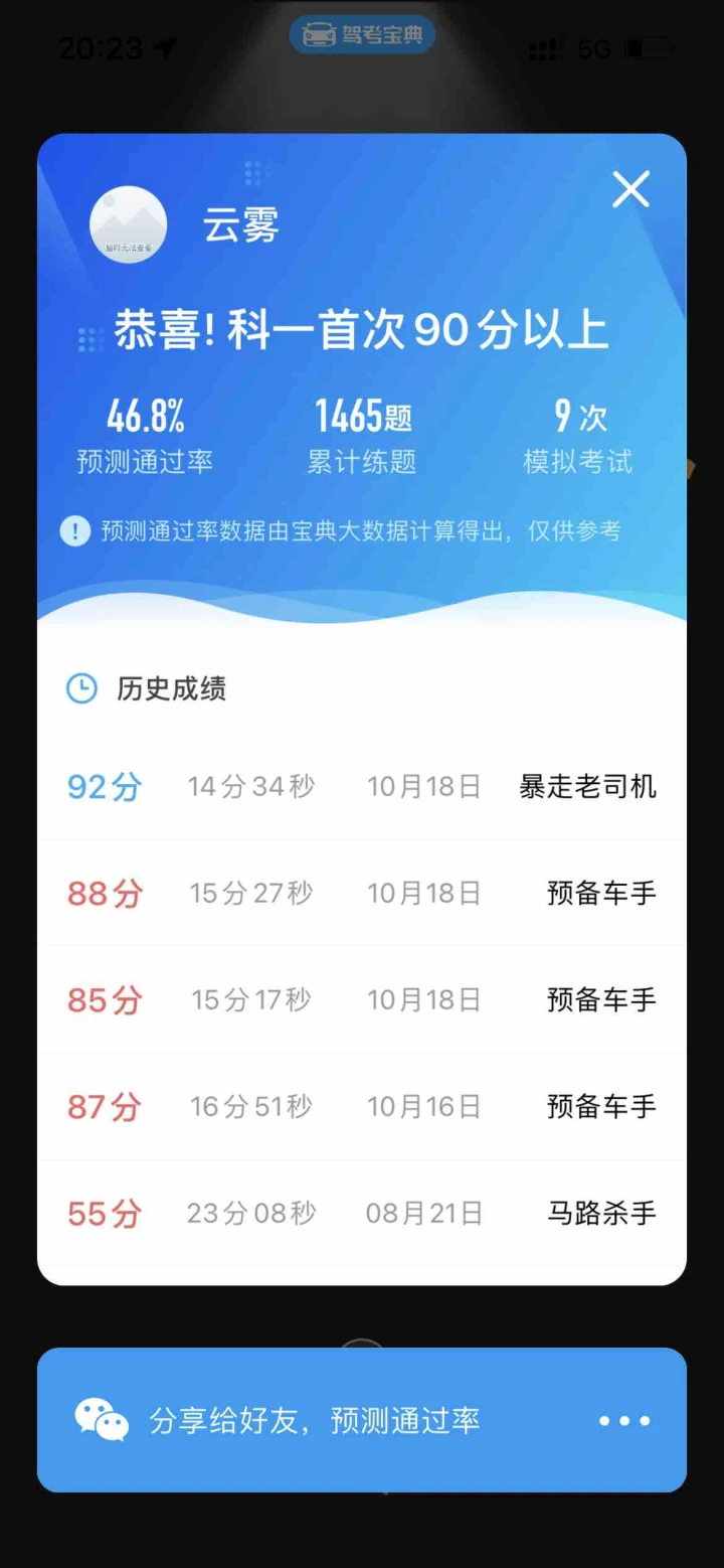 我考科一的前一天最高分刷到了88分,最后还是一把过,现在在备战科四😁😁