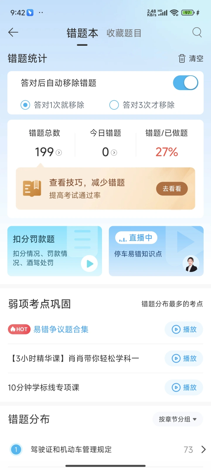 最好95以上 现在是时候把错题搞懂了 驾考宝典有个错题集,可以设置错题做对3次就移出错题集