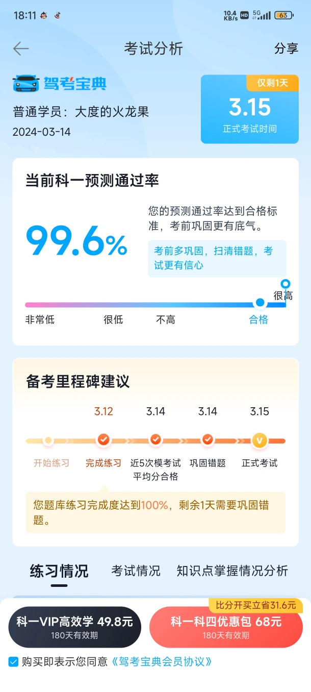 典典我正在学科一 我预约的考试时间是:3月15日 我现在的模拟考试成绩是最高98分 我觉得扣分题最难一定要看准车型和道路,不同的车型和道路对应不同的分数,非常难记可以找一下口诀帮助记忆,扣分题答题时还需要仔细的审题进行选择,避免回的题选错 。 复习交通法规,熟悉道路标志、标线及信号含义。 掌握车辆操作基础知识,了解安全驾驶常识。 强化应急处理能力,学习事故预防与处置方法。 熟悉考试题型,提高答题速度与准确性。 保持良好心态,自信应对考试。 祝我们顺利通过科一考试!