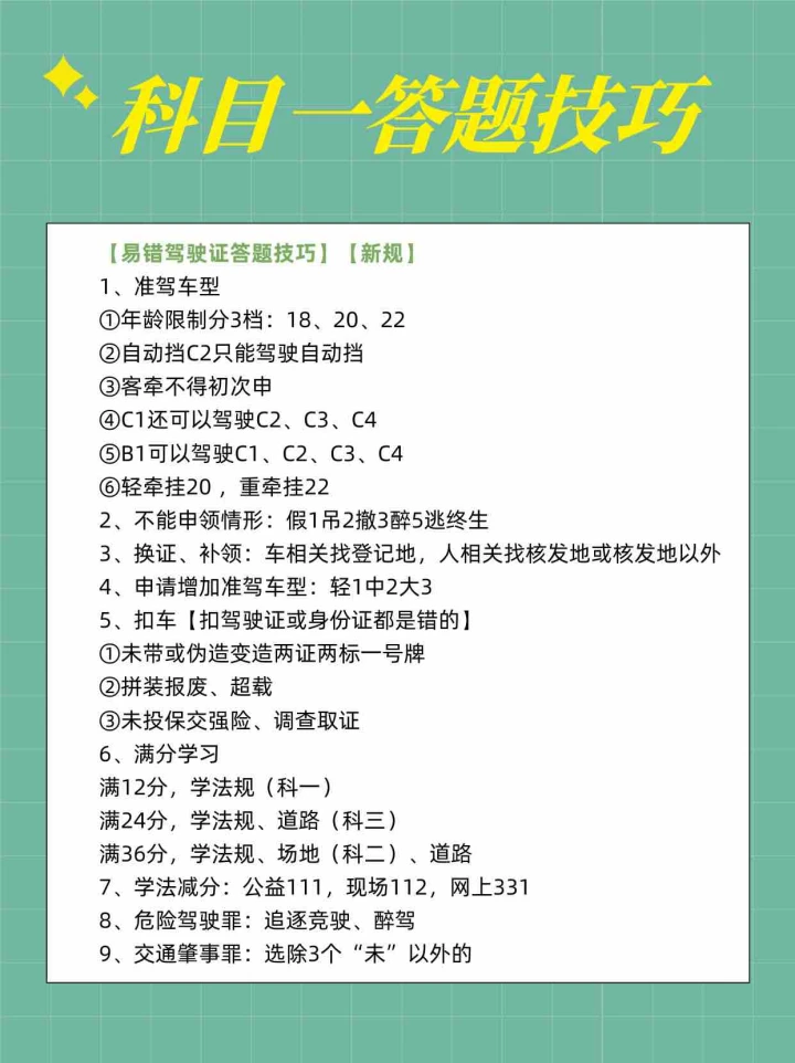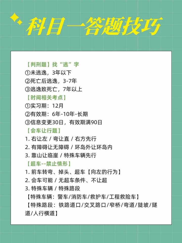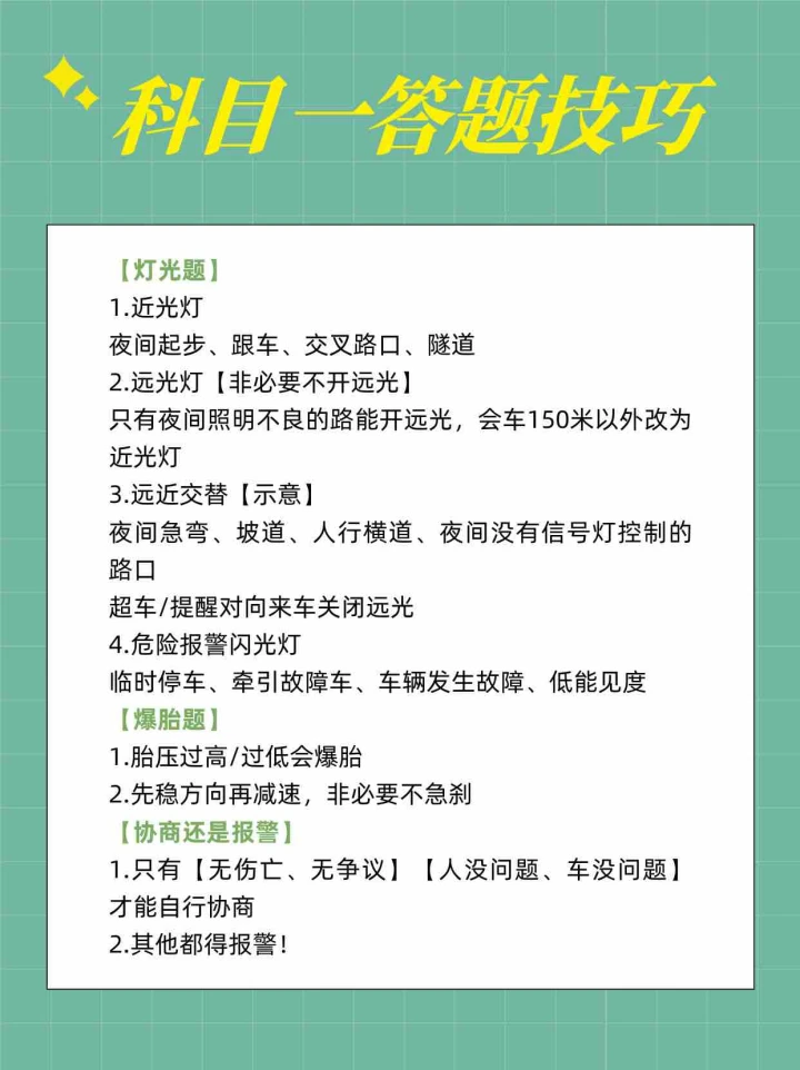 📚科目一高效备考:轻松找到窍门,事半功倍! 坦白说吧, 我就是那种记东西贼慢、考试勉强及格的普通人,科一那些规则对我而言就像一团乱麻。每次拿起书本,完全抓不住重点在哪,背了忘、忘了背,无限循环这种痛苦模式。模拟考成绩更是惨不忍睹,让我那会儿焦虑得不行。 —— 突然有一天,我刷到了肖肖的2小时抢分秘籍课,简直像发现新大陆一样!这课程让我的脑瓜子从一脸懵逼⇨变成了一脸自信爽歪歪。原来科一还能这样学,真是大开眼界! 既然受惠于此,我也决定把这份宝藏整理成一份简单易懂的口诀分享给大家,希望对大家备考科一能派上用场。 —— 科一嘛,关键还是得多掌握技巧、多做题。有些小伙伴平时不怎么复习,就指望着考试时候临时抱佛脚刷题,结果呢?补考费哗哗地交,要知道考驾照本身就不便宜,再加上补考费,想想都觉得肉疼啊! 所以呐,为了咱的钱包着想,咱们一定要用心记住这些口诀,踏踏实实刷题去。只要下定决心,没有什么过不去的坎儿!祝大家科一都能一次性顺利通过,加油!