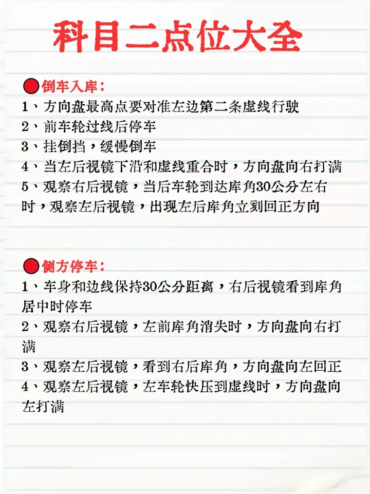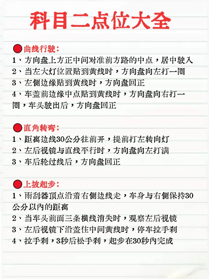 🔴倒车入库: 1、方向盘最高点要对准左边第二条虚线行驶 2、前车轮过线后停车 3、挂倒挡,缓慢倒车 4、当左后视镜下沿和虚线重合时,方向盘向右打满 5、观察右后视镜,当后车轮到达库角30公分左右时,观察左后视镜,出现左后库角立刻回正方向 🔴侧方停车: 1、车身和边线保持30公分距离,右后视镜看到库角居中时停车 2、观察右后视镜,左前库角消失时,方向盘向右打满 3、观察左后视镜,看到右后库角,方向盘向左回正 4、观察左后视镜,左车轮快压到虚线时,方向盘向左打满 🔴曲线行驶: 1、方向盘上方正中间对准前方路的中点,居中驶入 2、当左大灯位置贴到黄线时,方向盘向左打一圈 3、左侧边缘贴到黄线时,方向盘回正 4、车盖前边缘中点贴到黄线时,方向盘向右打一圈,车头驶出后,方向盘回正 🔴直角转弯: 1、距离边线30公分往前开,提前打左转向灯 2、左后视镜与直线平行时,方向盘向左打满 3、车后轮过线后,方向盘回正 🔴上坡起步: 1、雨刮器顶点沿着右侧边线走,车身与右侧保持30公分以内的距离 2、当车头前面三条横线消失时,观察左后视镜 3、左后视镜下沿盖住中间黄线时,停车拉手刹 4、拉手刹,3秒后松手刹,起步在30秒内完成 除了平时认真练习外,考前模拟也非常重要,很多学员觉得没必要或不划算,这里告诉大家一个性价比很高的看考场方法,到驾考宝典的真实考场里找到自己所在地的考场,可以在手机上全方位观看,还能练习和模拟考试,大家可以去试一试,最后祝你们一把过,顺顺利利,加油✅💯💯