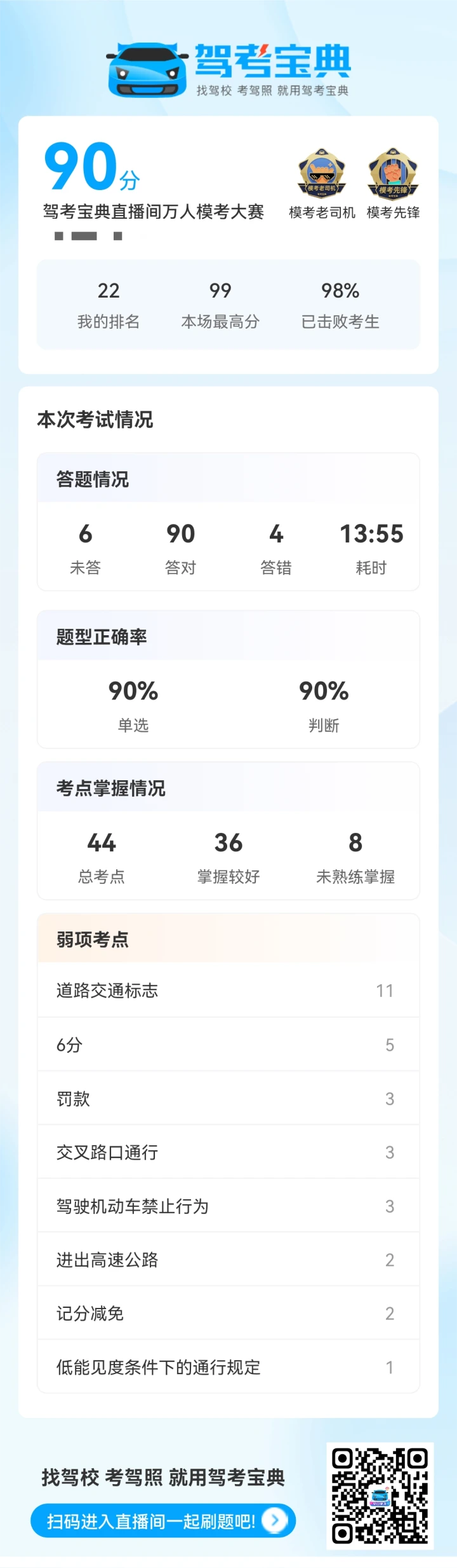 提醒大家,备考时千万别有侥幸心理,认真对待每一道题。有时候你觉得这道题不会就不记了,考场上就有这道题。 我复习时,扣分题和罚款题总是让我头疼,错误率高到我都不想继续刷题了。但后来我看了肖肖老师的科一课程,学到了不少解题技巧和记忆口诀,这让我刷题效率大大提高。 快考试的时候,朋友推荐我试试驾考宝典每周五的万人模考活动。我心想,反正也不费事,就参加了。结果在考试中,我发现很多题目都特别熟悉,模考中就见过了,所以很快就答完了。 所以说朋友们,考前的模拟训练太重要了。真心推荐你们去参加这个模考活动,最后,祝大家科一考试都能一次顺利通过,加油!